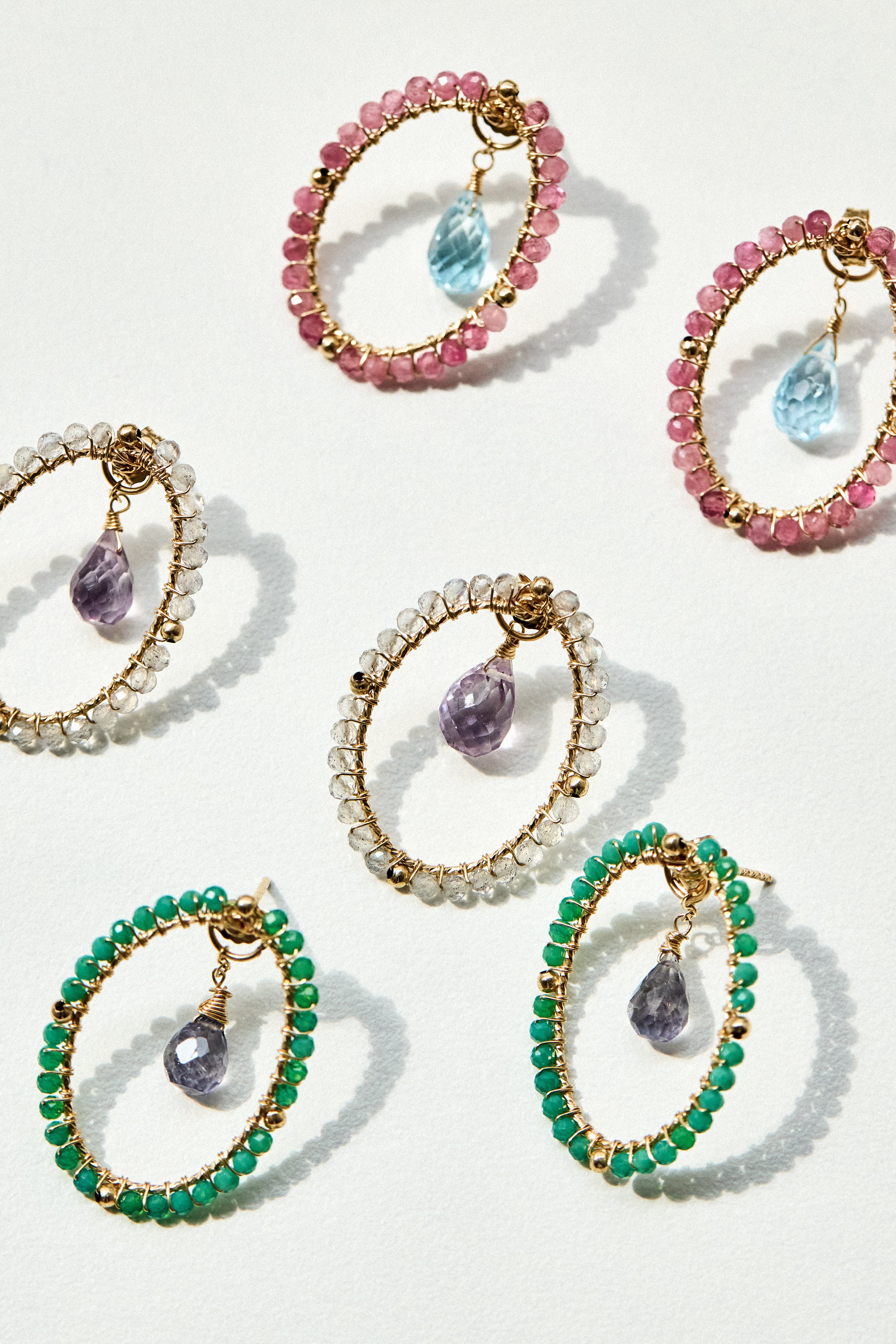 A dual-use earring collection inspired by shifting light and nature, each pairing Brazilian pear-cut gemstones with hand-wired halos — elegant, magical, and effortlessly wearable from day to night.