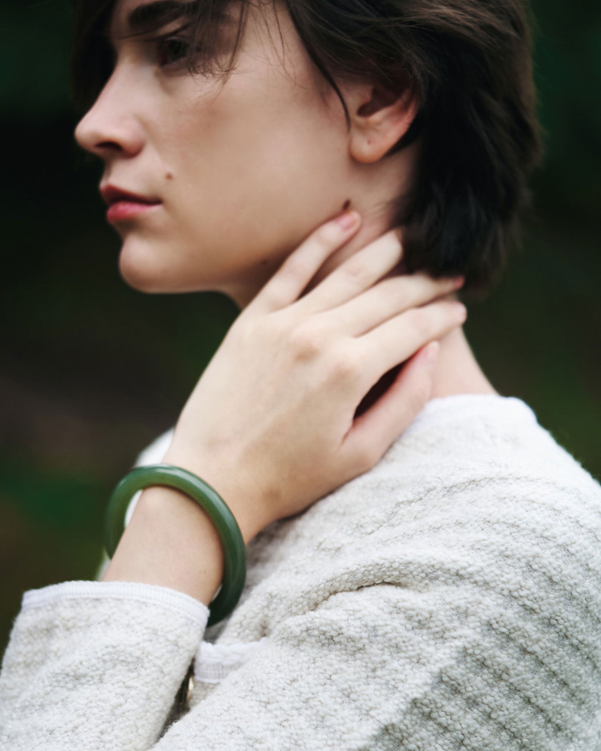 Spontaneous. Calm or charismatic or gummy and aromatic - this series has it all. In Yukimoto's Jade Bangle collection, witness beautiful premium quality Nephrite Jade from China in Mochi Green, River Flow, and Army Green. Exacting a retro yet perennial and enduring sense of simplicity, this collection suits any mood, any gender, or any age.