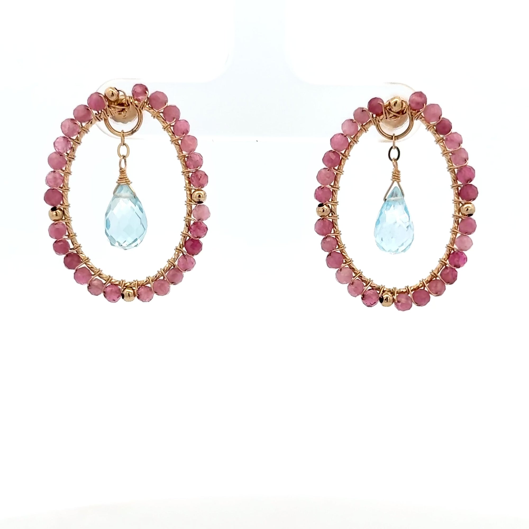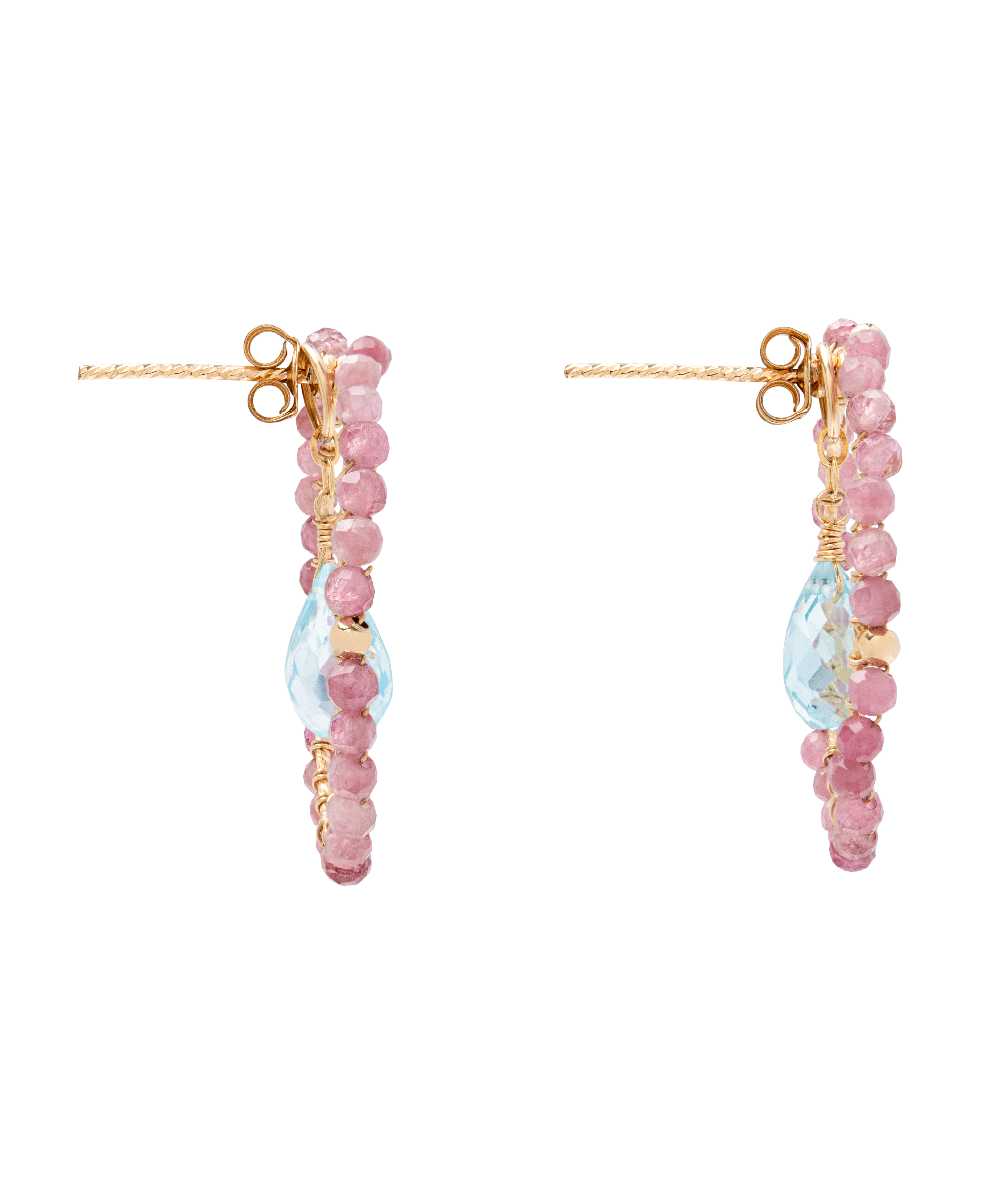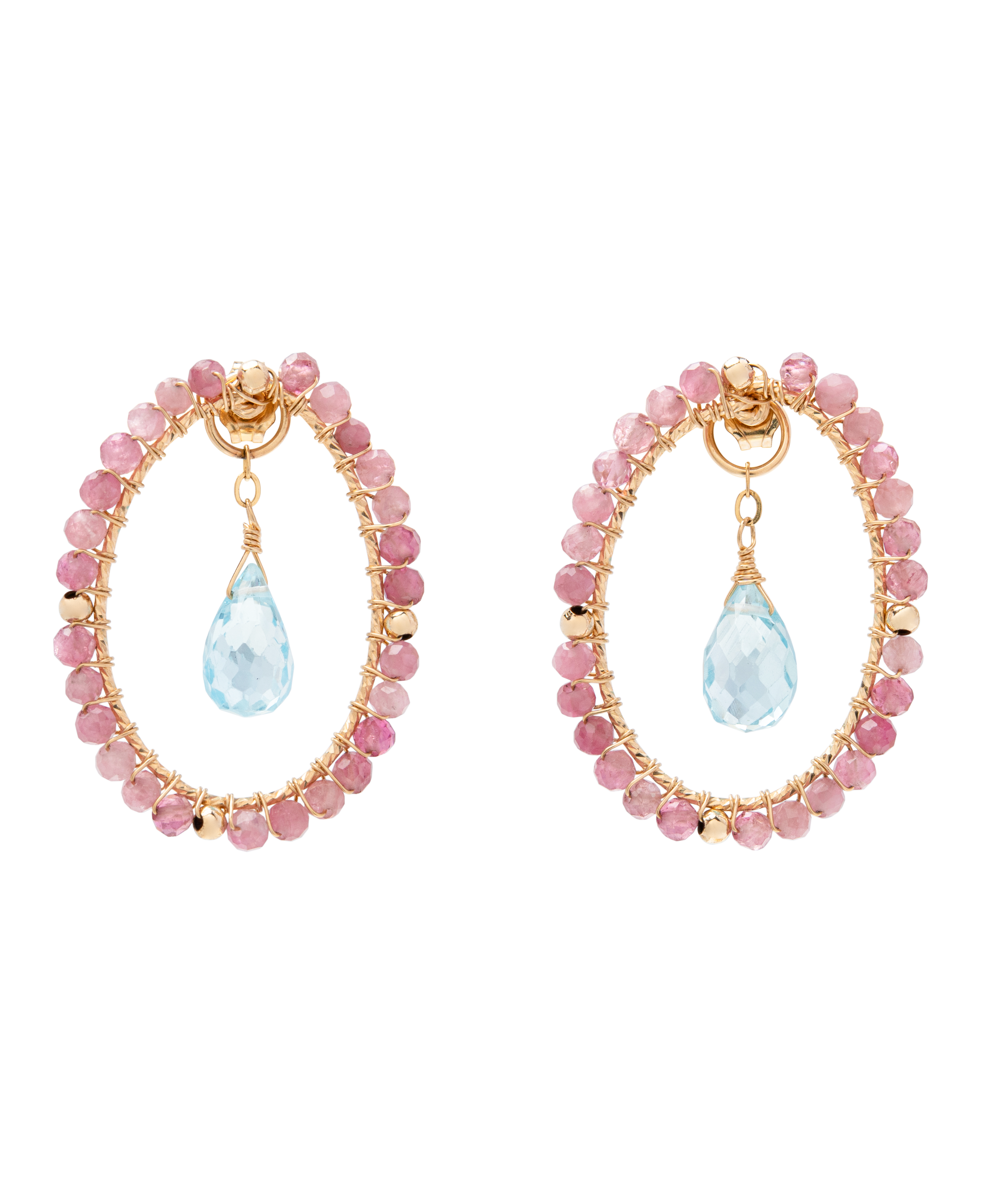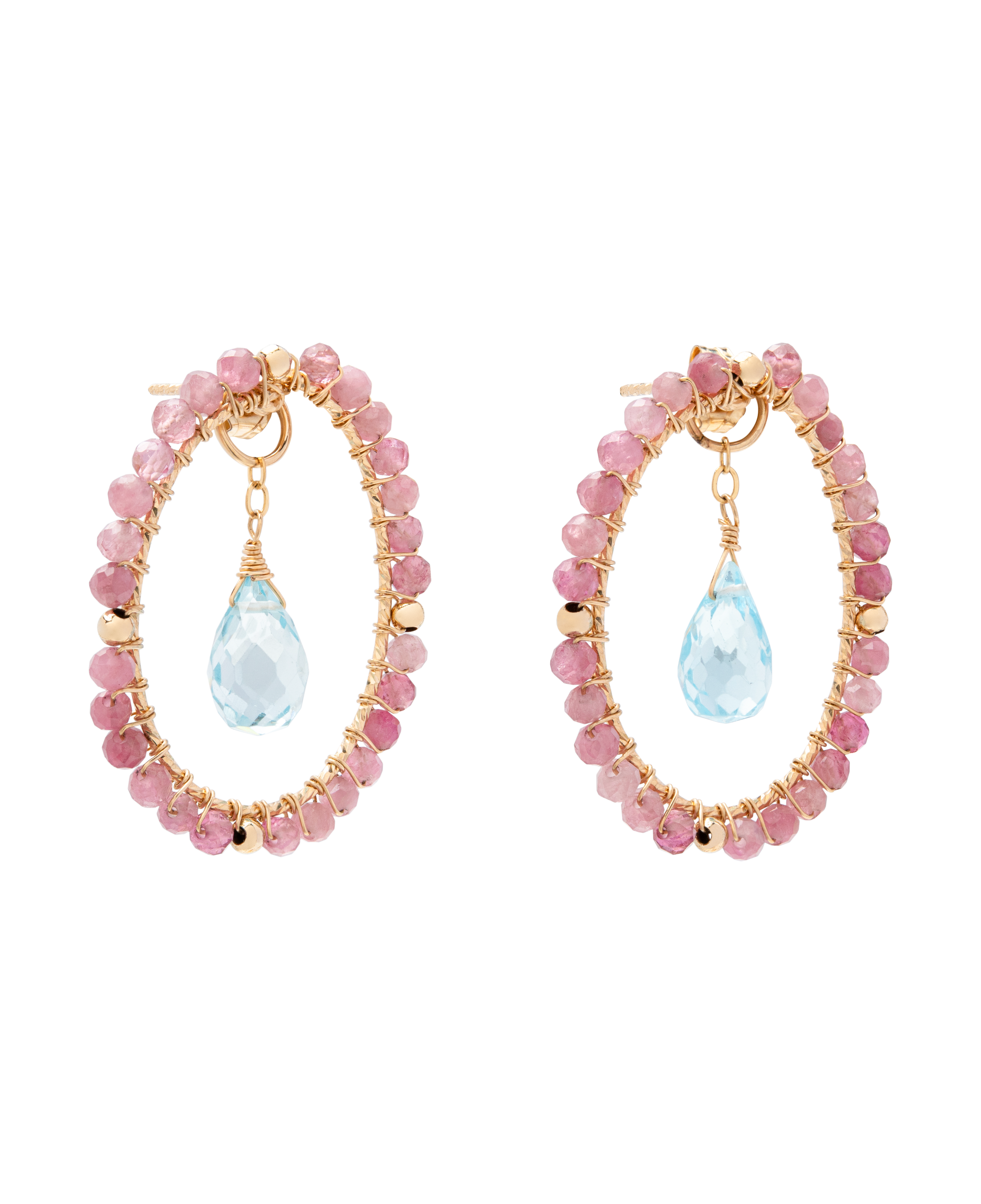 The Aurora Kiss Earrings capture the first light of dawn, it is soft, luminous, and full of new energy. A faceted Brazilian Blue Topaz glows at the centre, its sky-blue clarity radiating calm and brightness. Framing it, a halo of Pink Tourmaline beads adds a rosy warmth, each one hand-wired by skilled artisans to create a perfectly balanced, airy silhouette. Crafted in 14KGF, this dual-use design can be worn as a full statement hoop or the inner Blue Topaz drop can be removed and worn as a pendant.