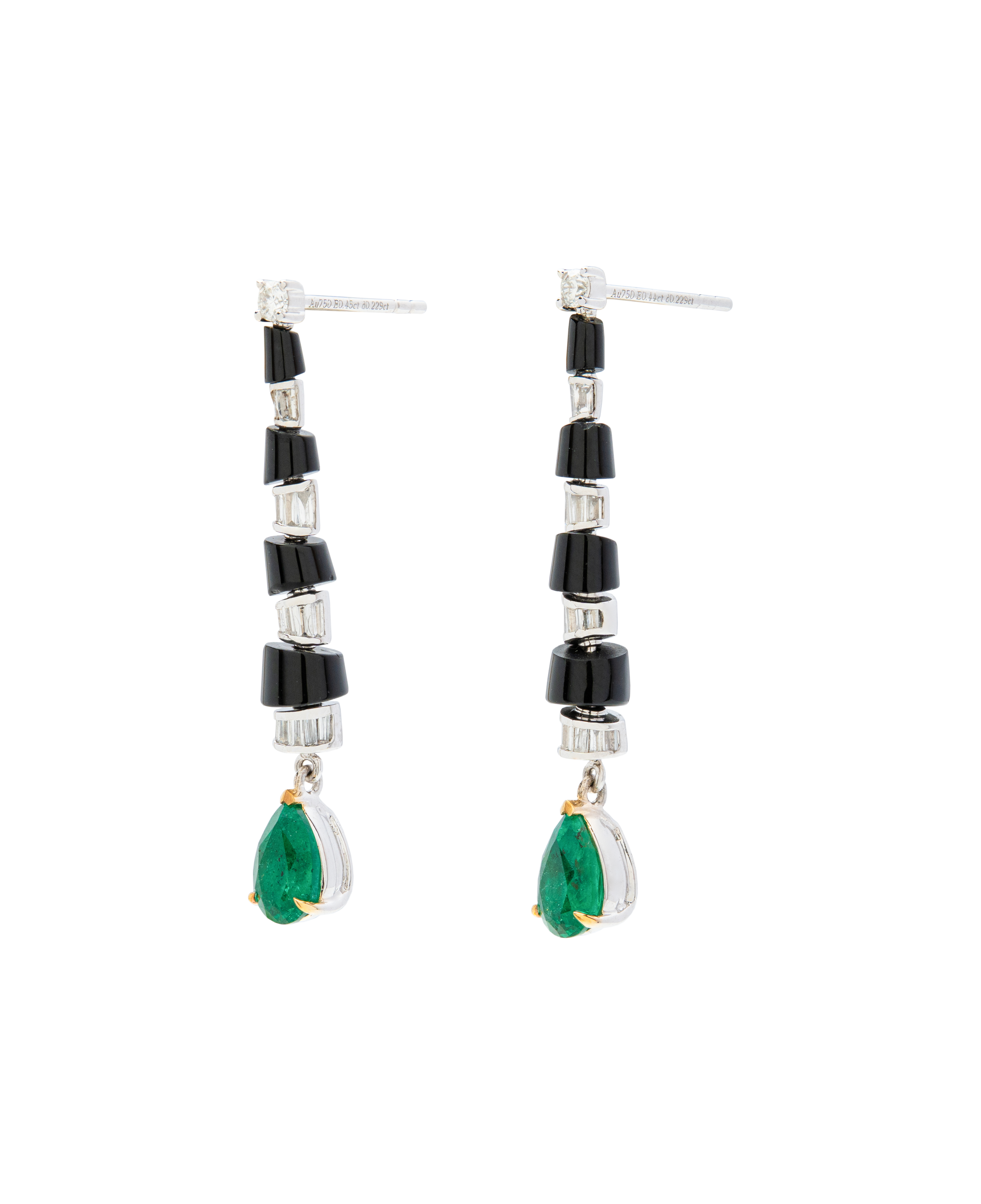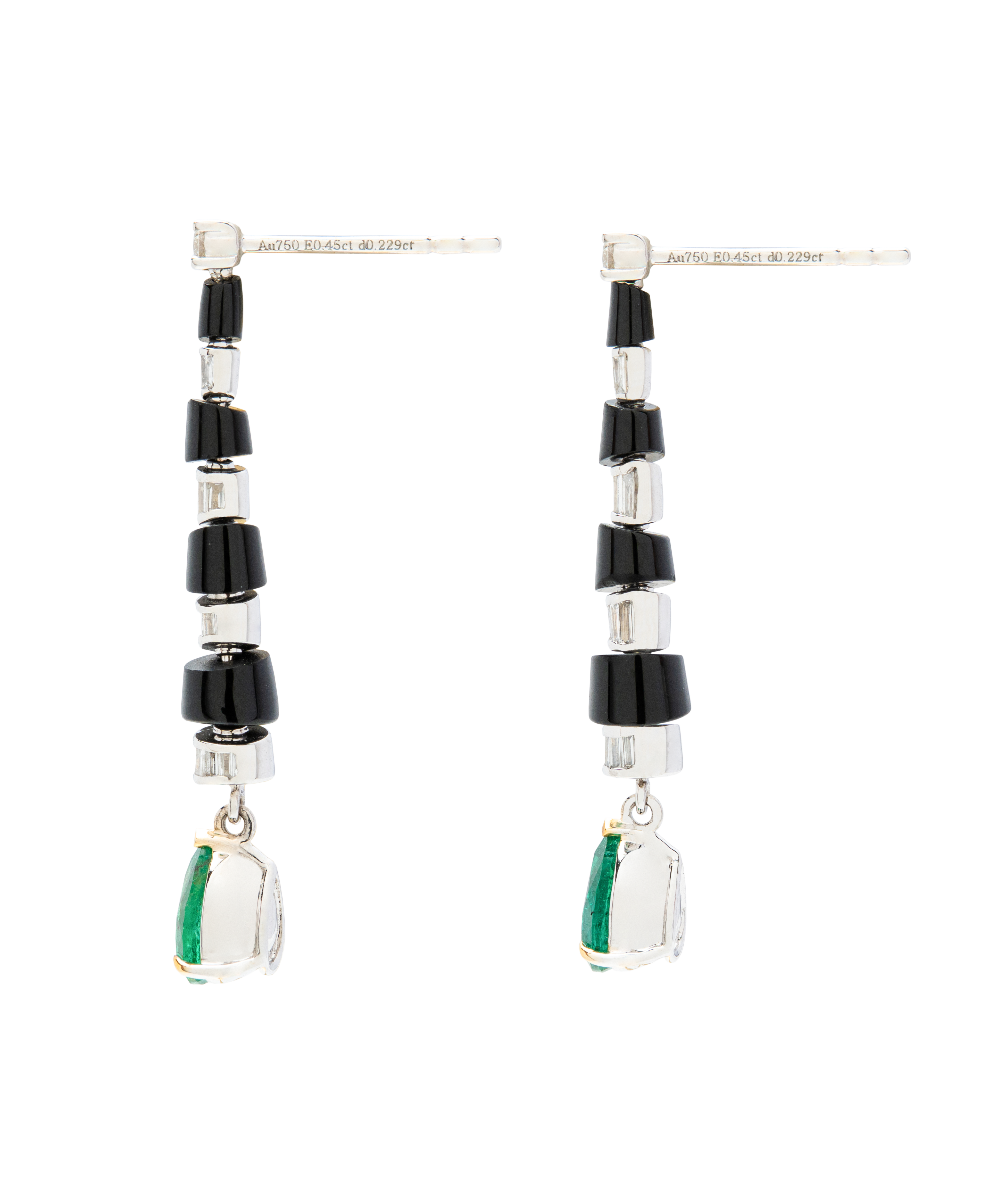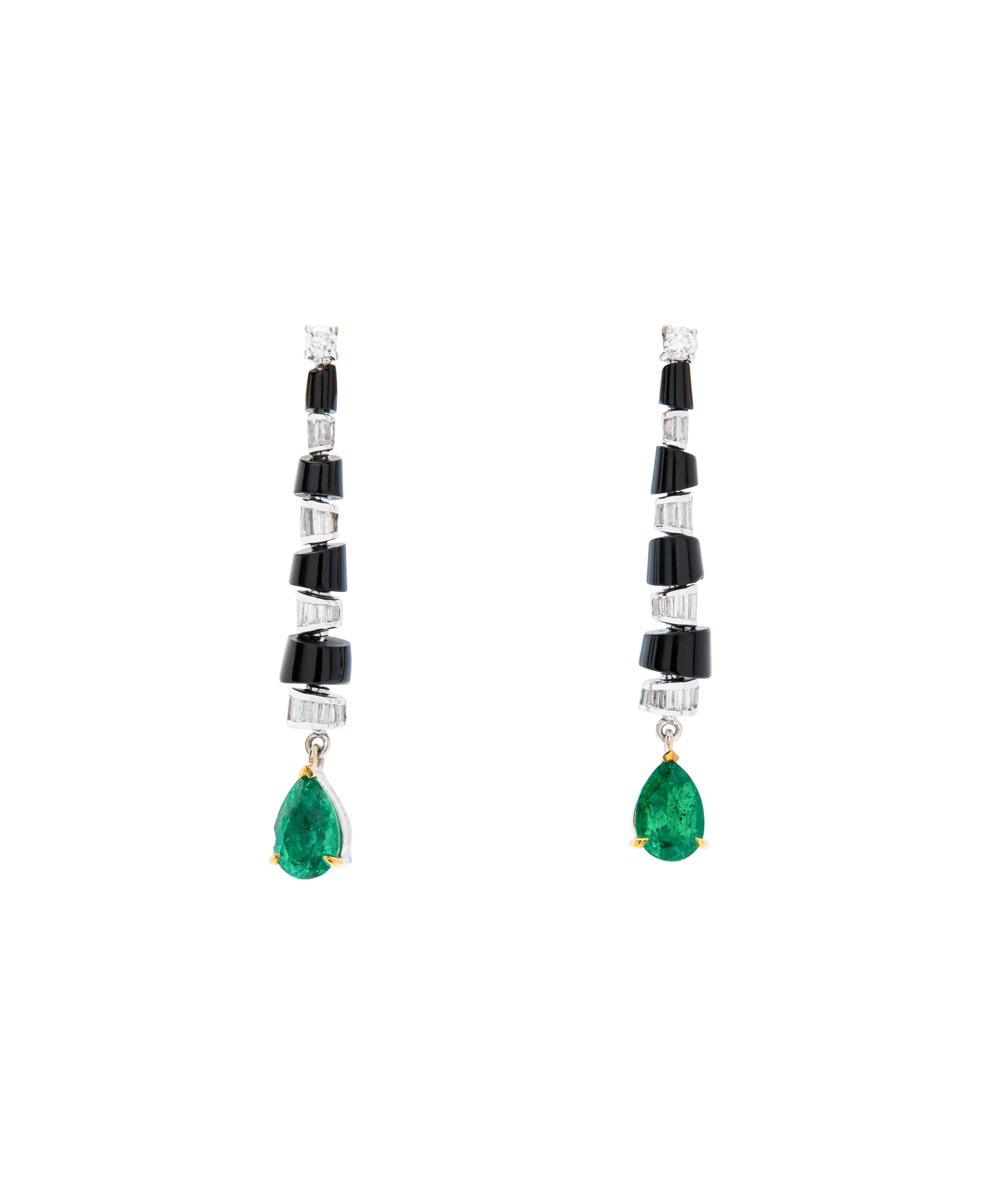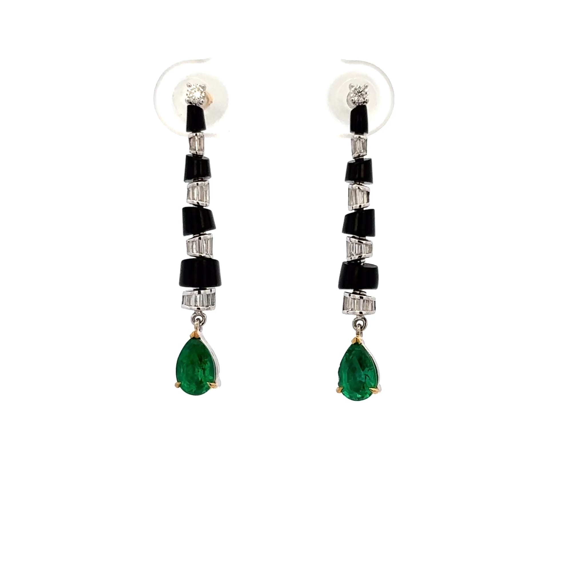 These dangling earrings feature a rhythmic, cascading design that draws the eye downward. Polished black agate cylinders are accented with diamonds, leading to a vivid emerald drop that brings fluid movement and quiet structure to the silhouette.