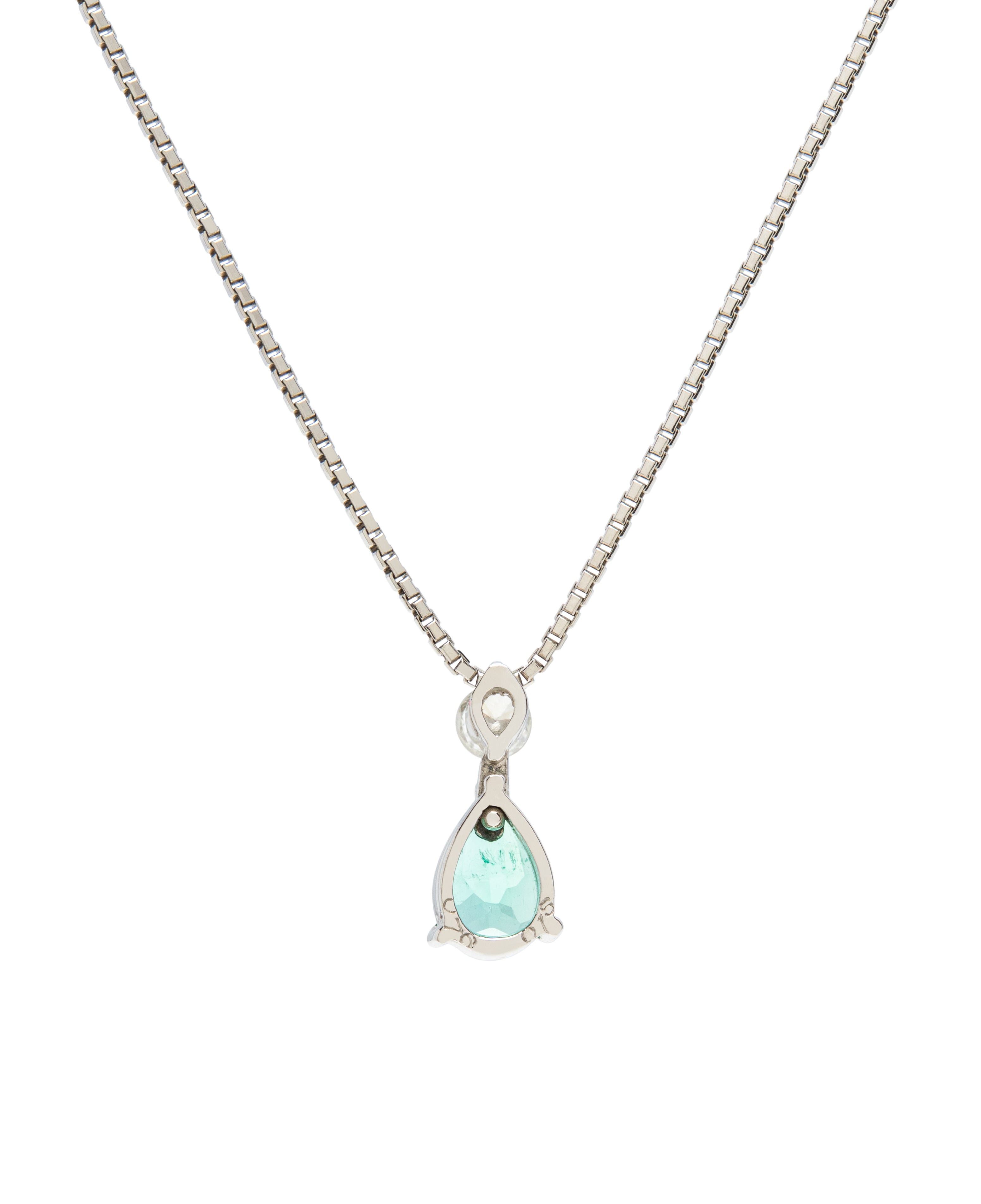 This elegant necklace features a pear-cut emerald as its luminous focal point. Suspended from a delicate chain, the gemstone is crowned with...