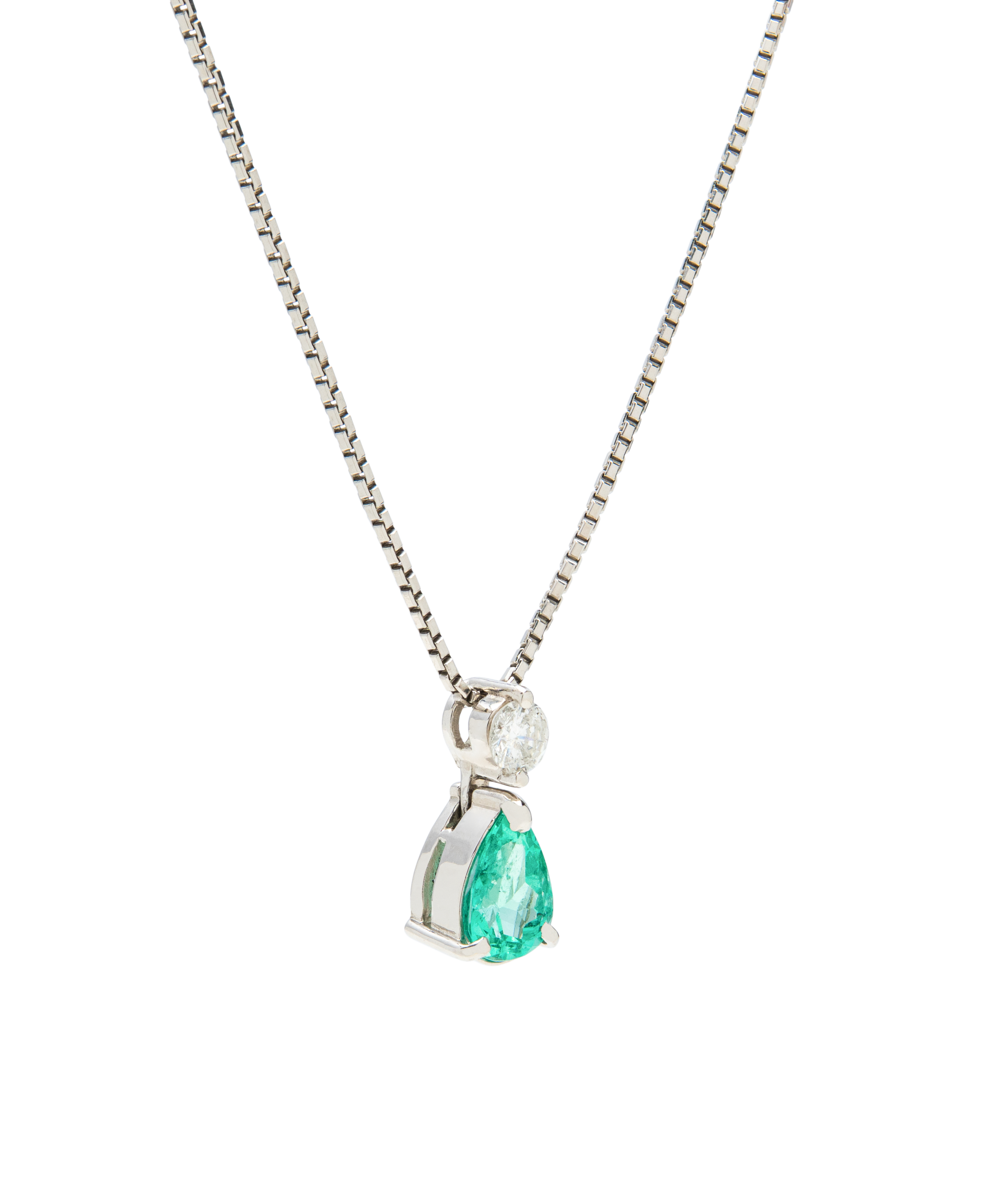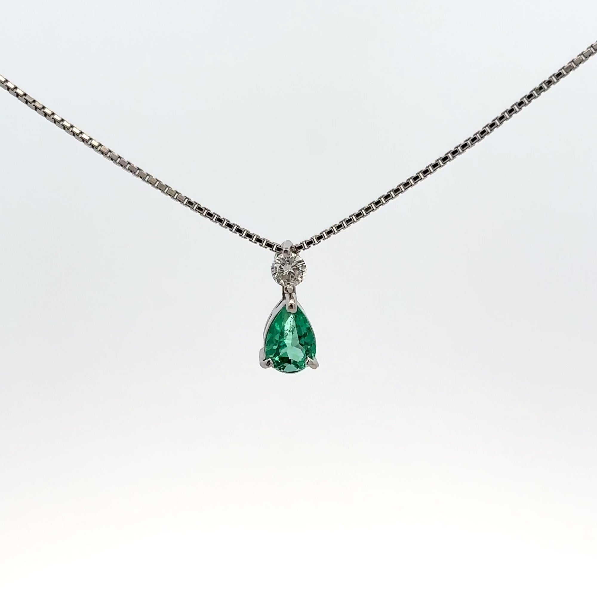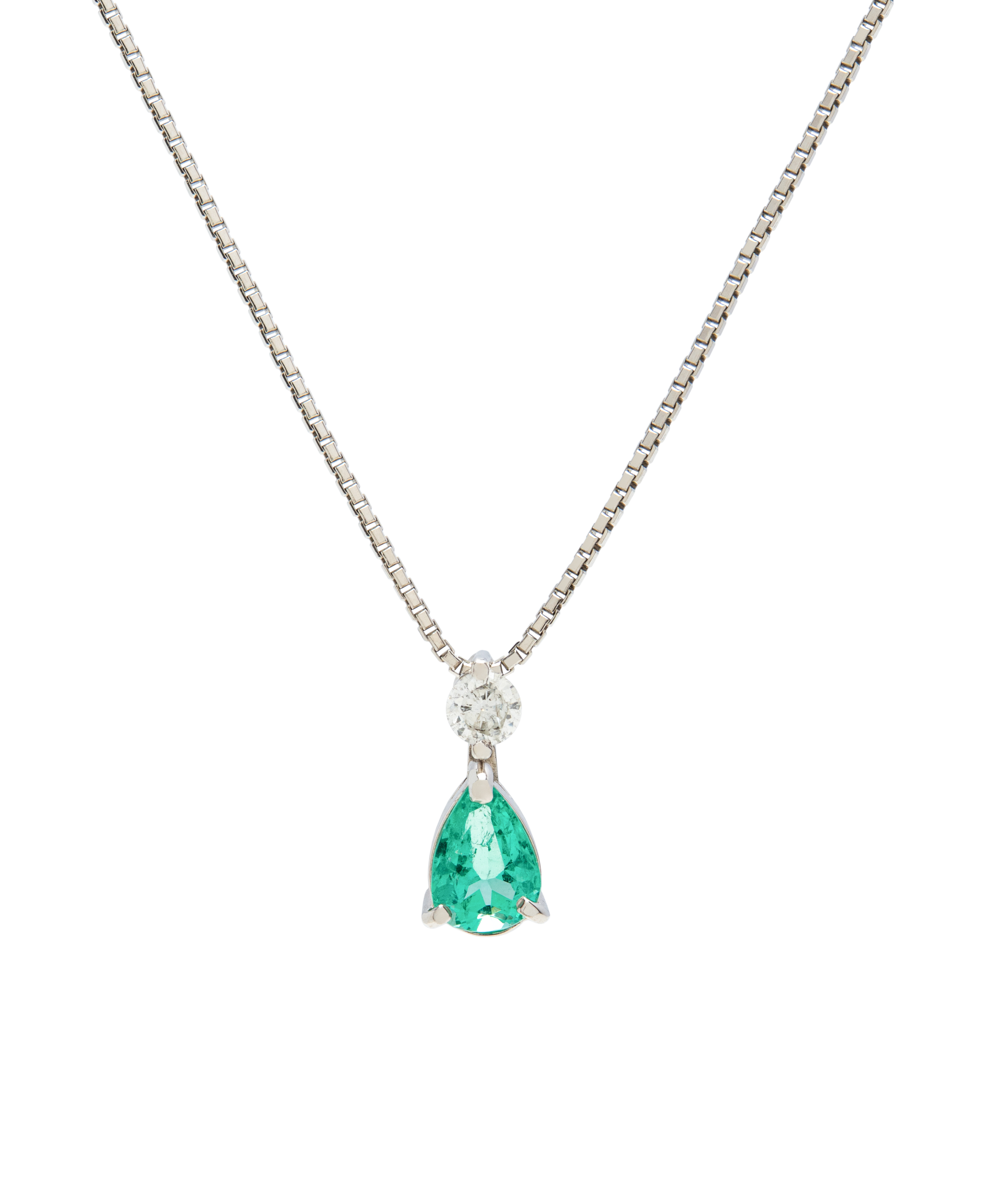 This elegant necklace features a pear-cut emerald as its luminous focal point. Suspended from a delicate chain, the gemstone is crowned with a single brilliant-cut diamond, adding a refined touch of fire to the emerald’s deep green tone.