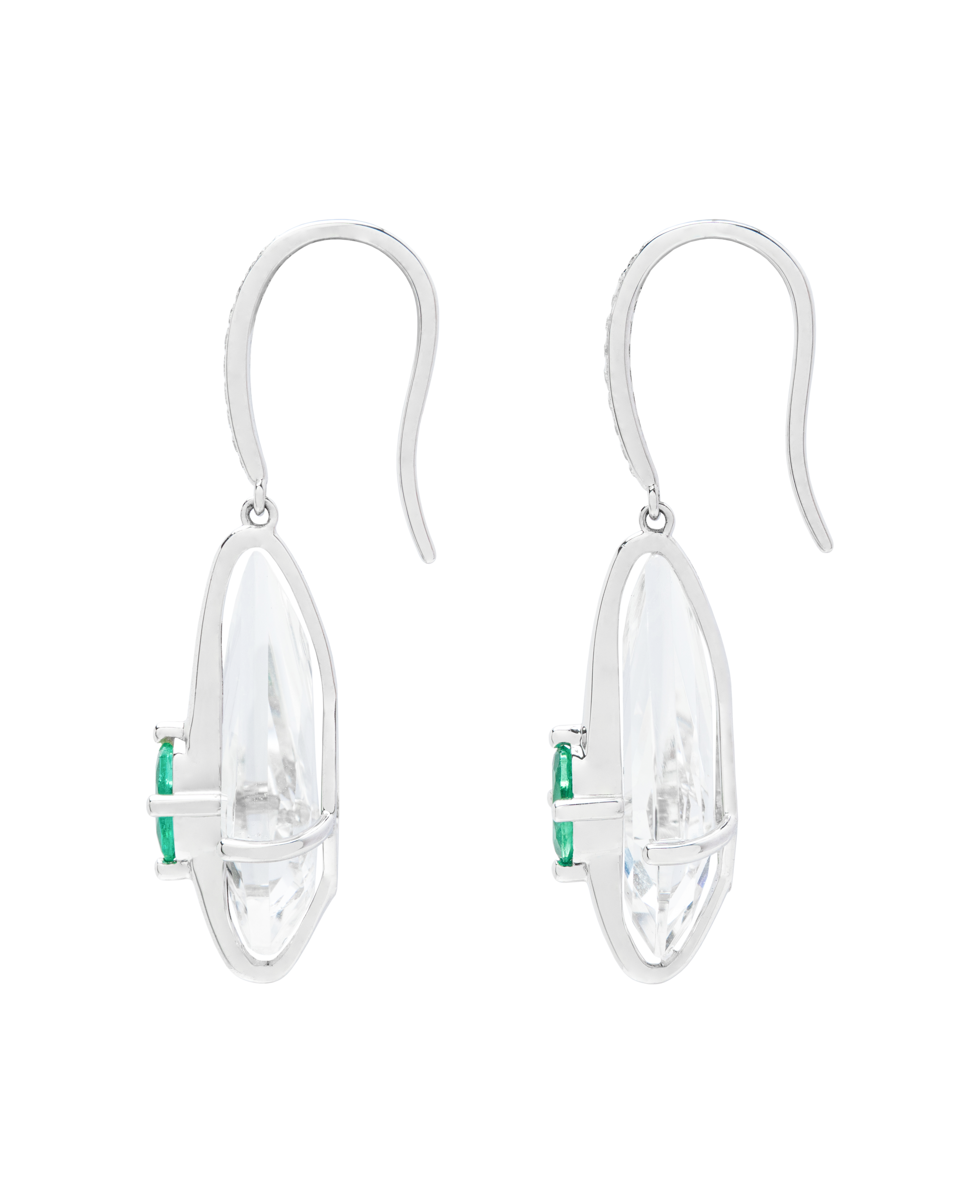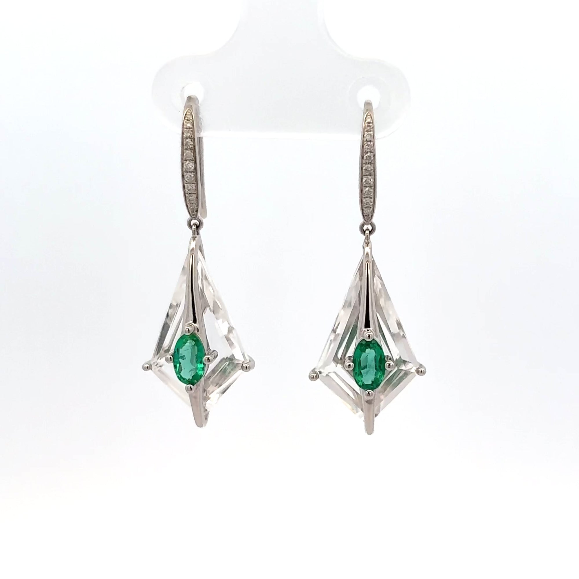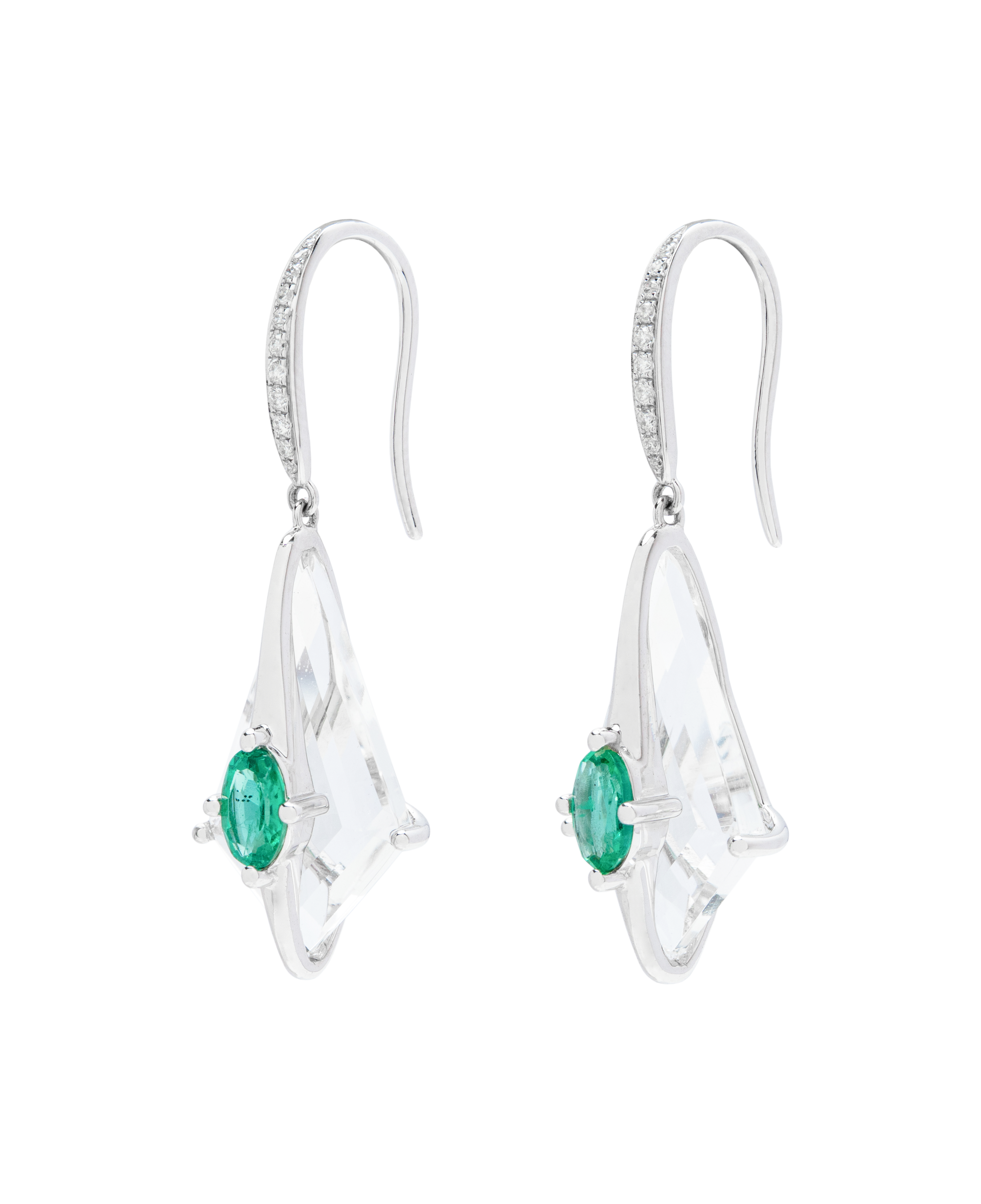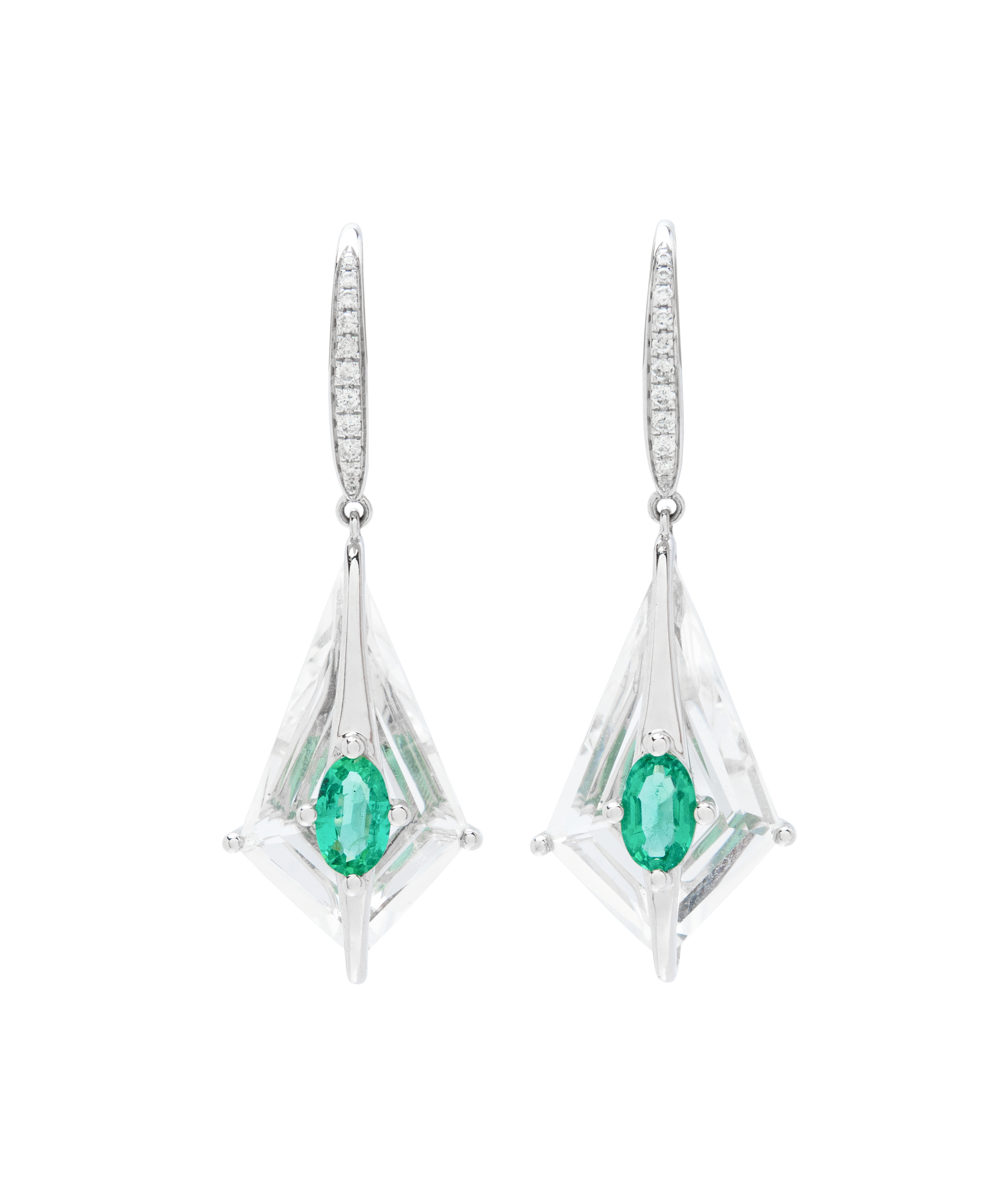 These lightweight, kite-shaped drop earrings feature vivid emeralds layered over clear rock crystal, accented with a delicate shimmer of pavé diamonds. Set in 18K white gold, the geometric framework creates a subtle floating effect—balancing contemporary edge with timeless grace.