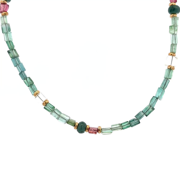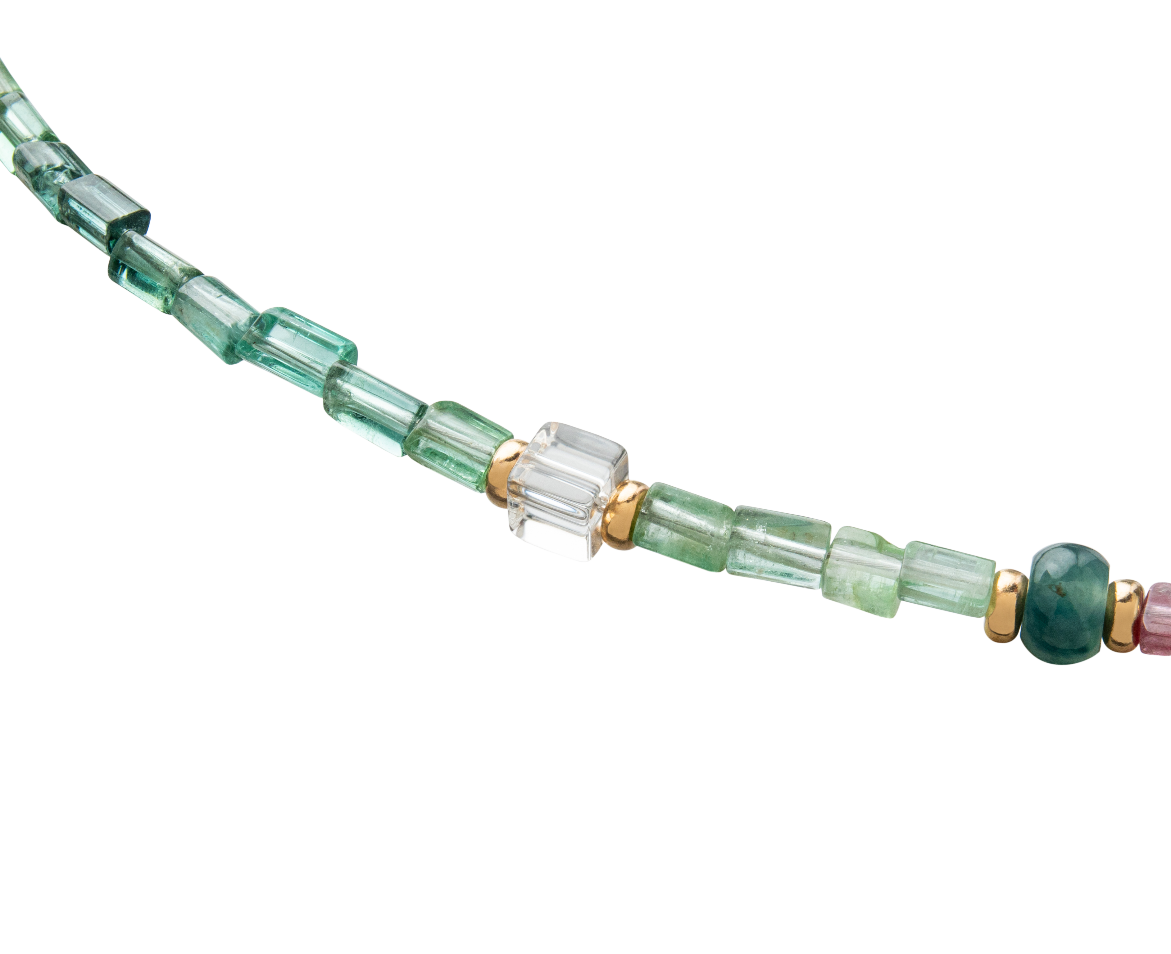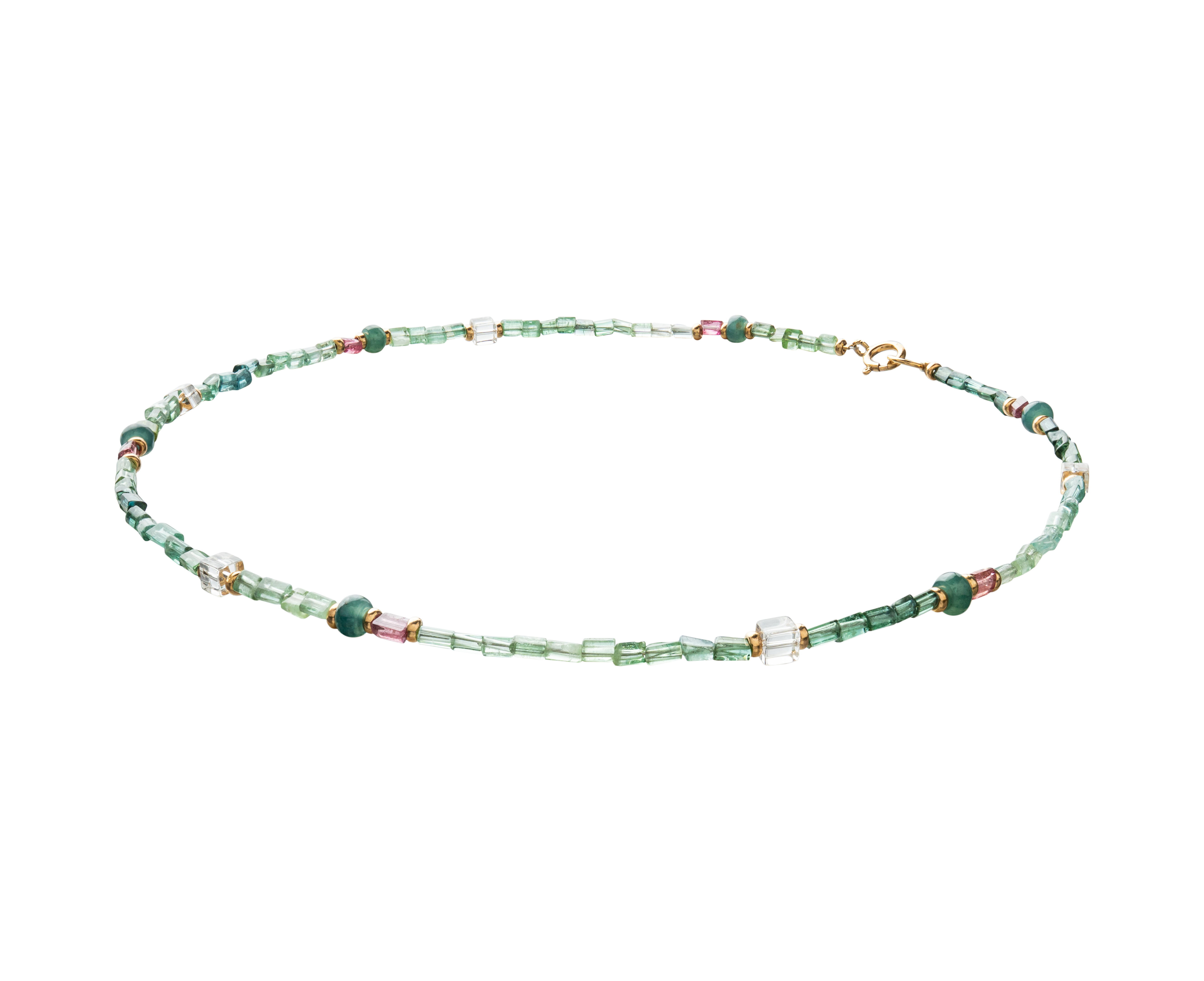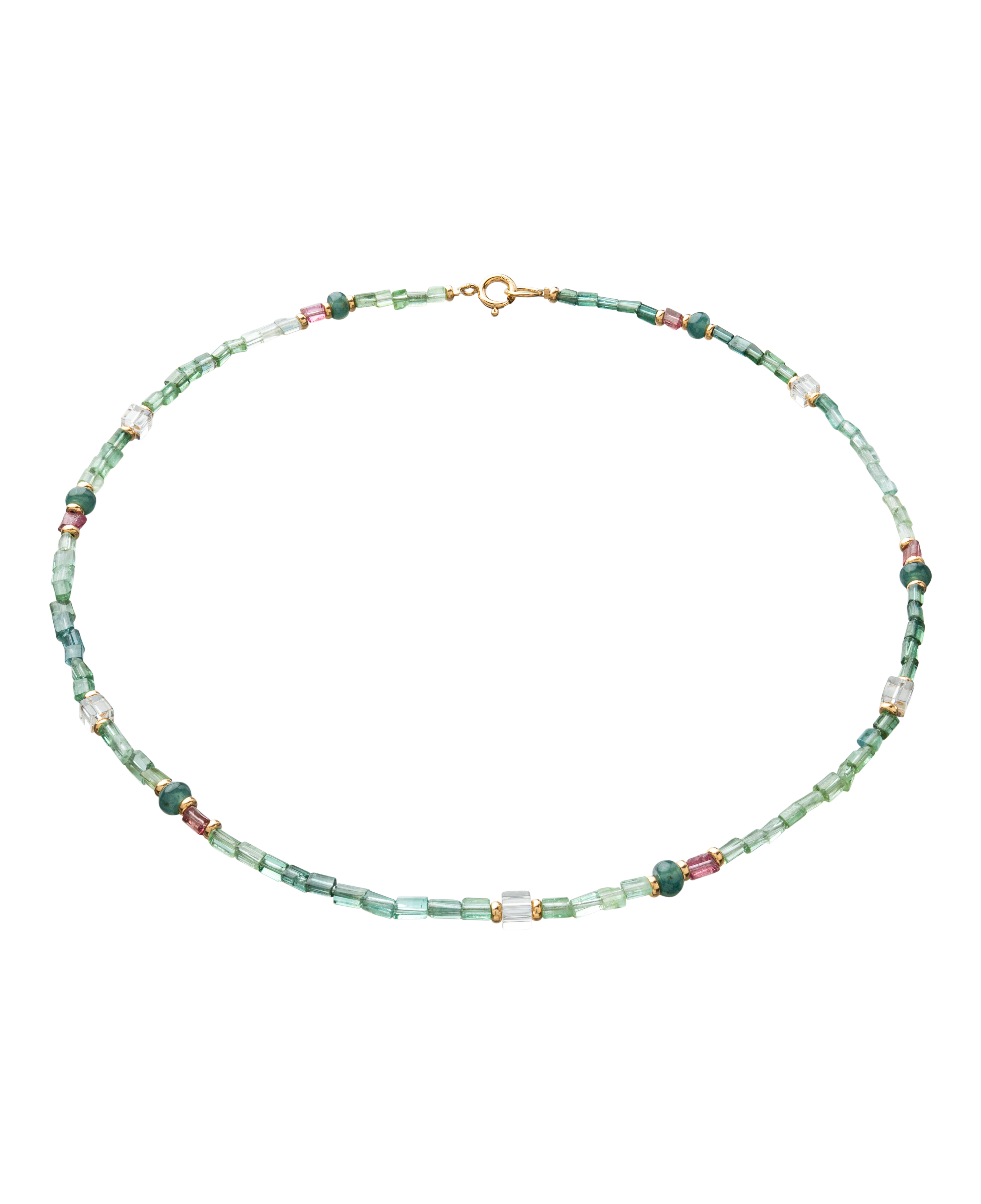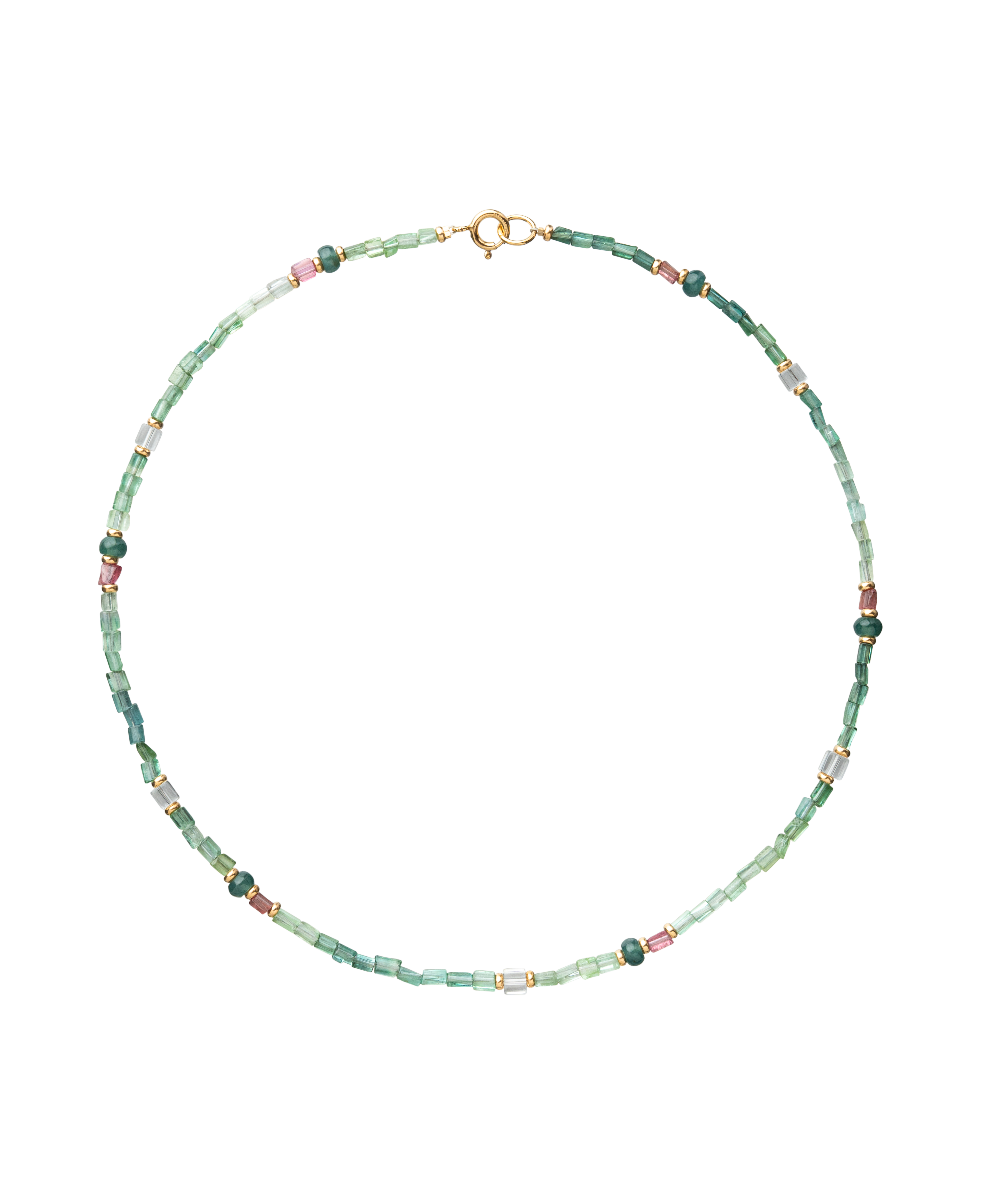 Inspired by the quiet beauty of dawn gardens veiled in soft mist, the Garden of Mist Tourmaline Necklace captures serenity through a delicate harmony of hues and textures. Hand-strung with a natural blend of Pink Tourmaline, Green Tourmaline, Himalayan Quartz, and Jadeite, each gem brings its own rhythm — from rosy blush to tranquil green to the clear stillness of mountain light. Smooth and faceted beads catch the light with subtle brilliance, forming a refined yet organic composition. Accented with 14K gold-filled details, it evokes the elegance of morning dew resting upon leaves — understated, pure, and endlessly wearable.
