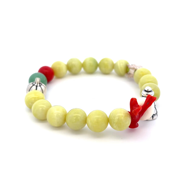 ‘This a season of red and green and of yellow and white, and gold and silver - Christmas. In this bracelet, yellow Canadian Jade represents the rare sunshine and warmth of winter. Boldly contrasting against the yellow are the gemstones representing the main colors of Christmas which are green Aventurine, bright red Cinnabar, and the unique red Italian Sardinian Coral. Meanwhile, a sustainably sourced Mammoth Ivory bead represents a white Christmas. Further embellished with the pumpkin, snowflake, and Christmas tree handmade in Sterling Silver, this bracelet is a bold and creative ode to the merry season. Let’s be grateful, celebrate, and reconcile this season with the Holiday21 bracelet - a wintry holiday re-imagined.