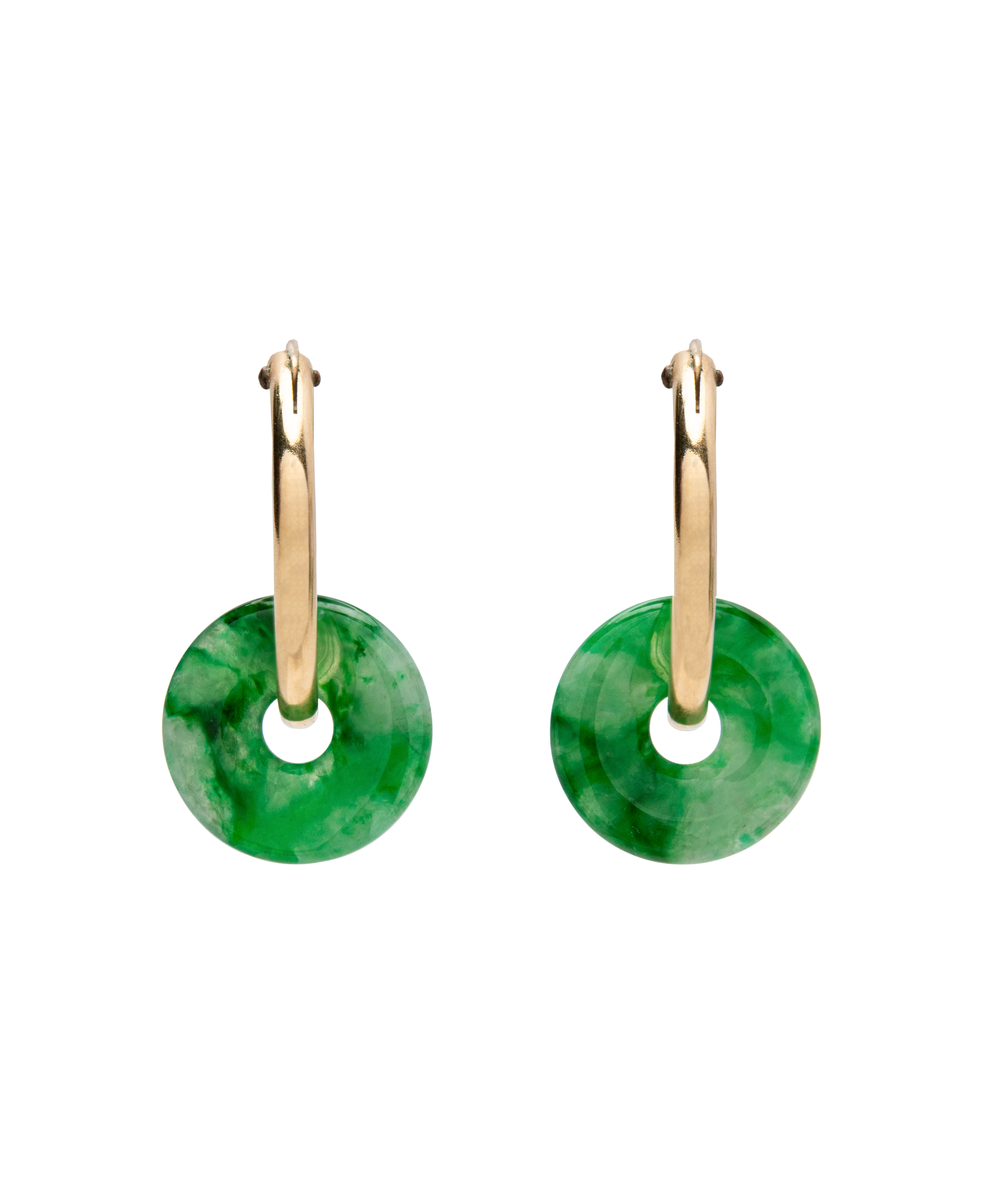 An antique porcelain-like canvas glazed with fruity green, this Jadeite blooms with natural halos, as if painted by water and light. 100% natural Type A Jadeite from Burma, in a timeless donut silhouette for versatile styling. A stone of harmony, luck, and protection, treasured for its enduring elegance, classically yours.