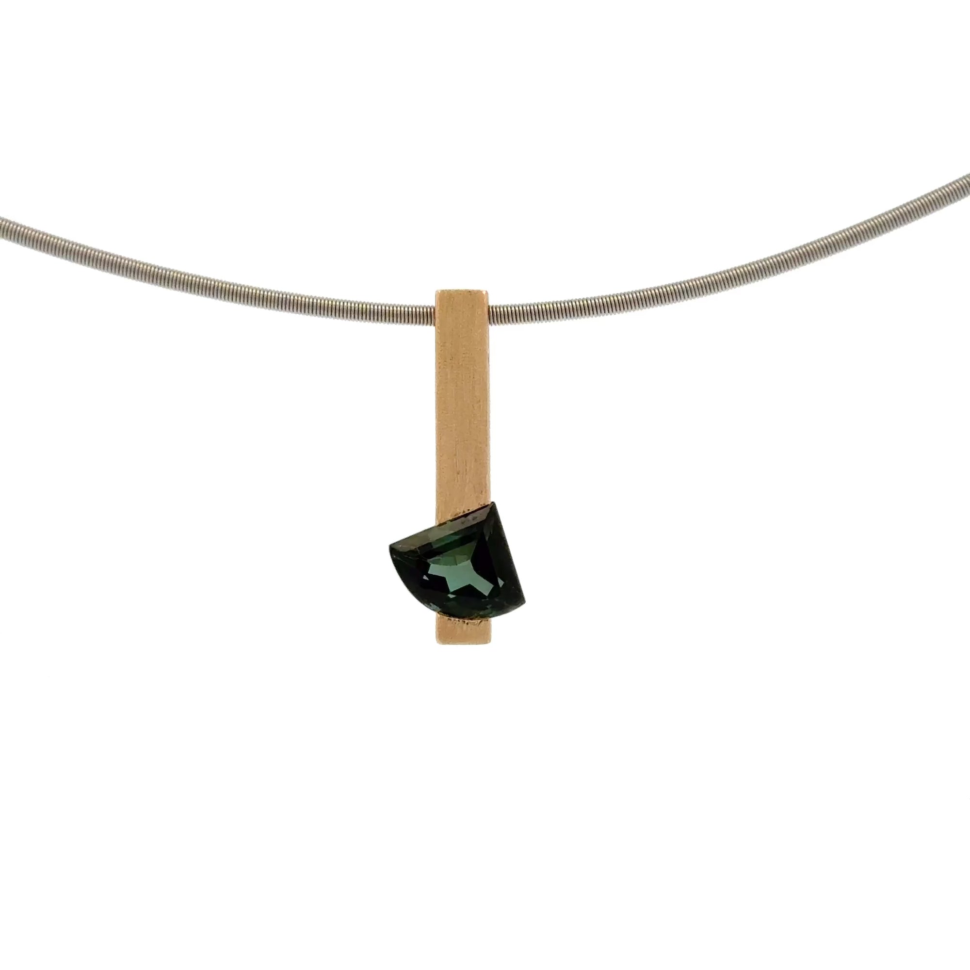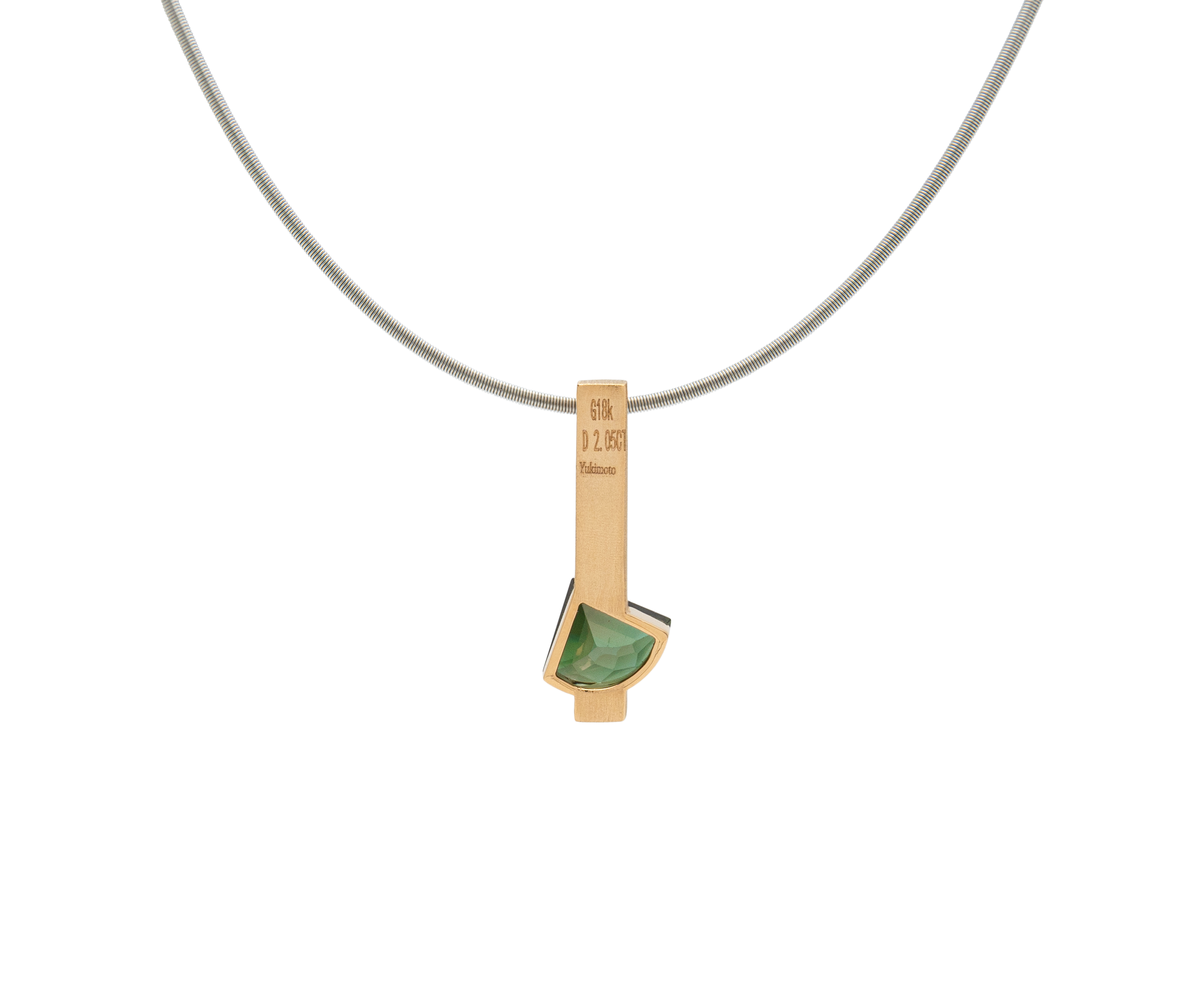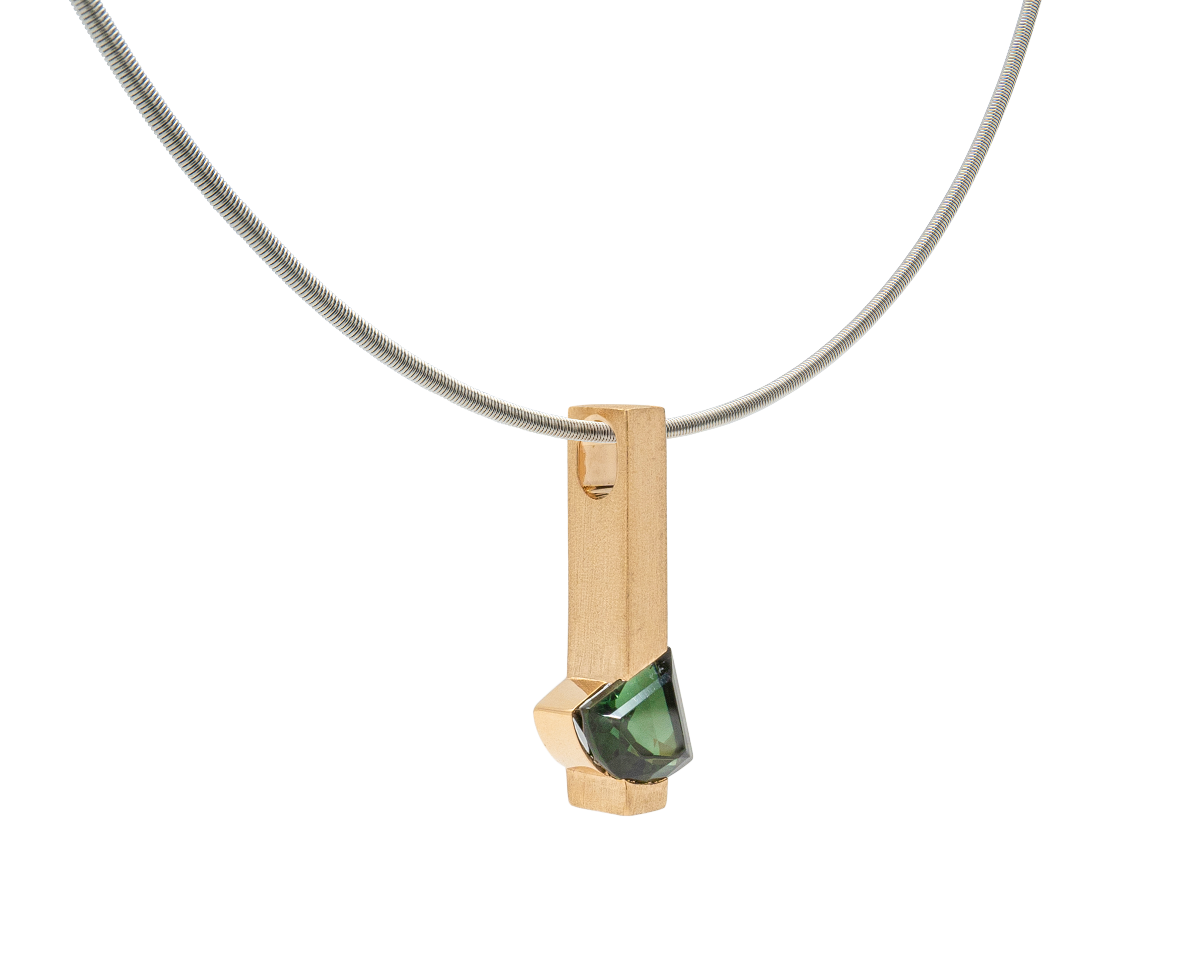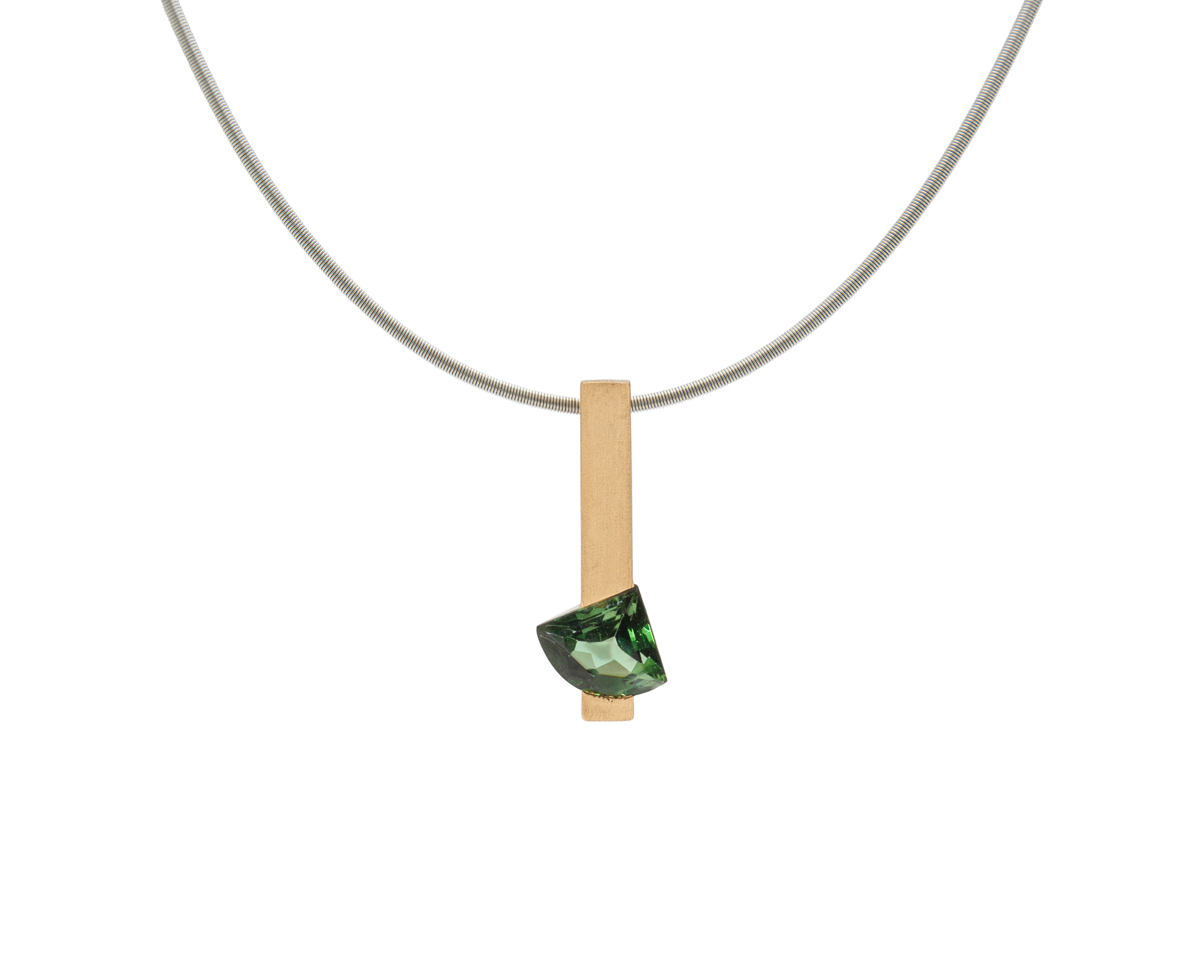 Inspired by pure geometry and modern architecture, the Jolly Tourmaline Rod Pendant is a study in contrast and elegance. A richly coloured, fancy-cut tourmaline—offered in green or rose—is set against a sleek vertical bar of 18k gold with a hand-polished satin face. The bold angular form of the stone creates a sculptural dialogue with the clean architectural lines of the gold setting. This interplay of structure and colour, line and light, captures a refined balance between natural brilliance and minimalist design.