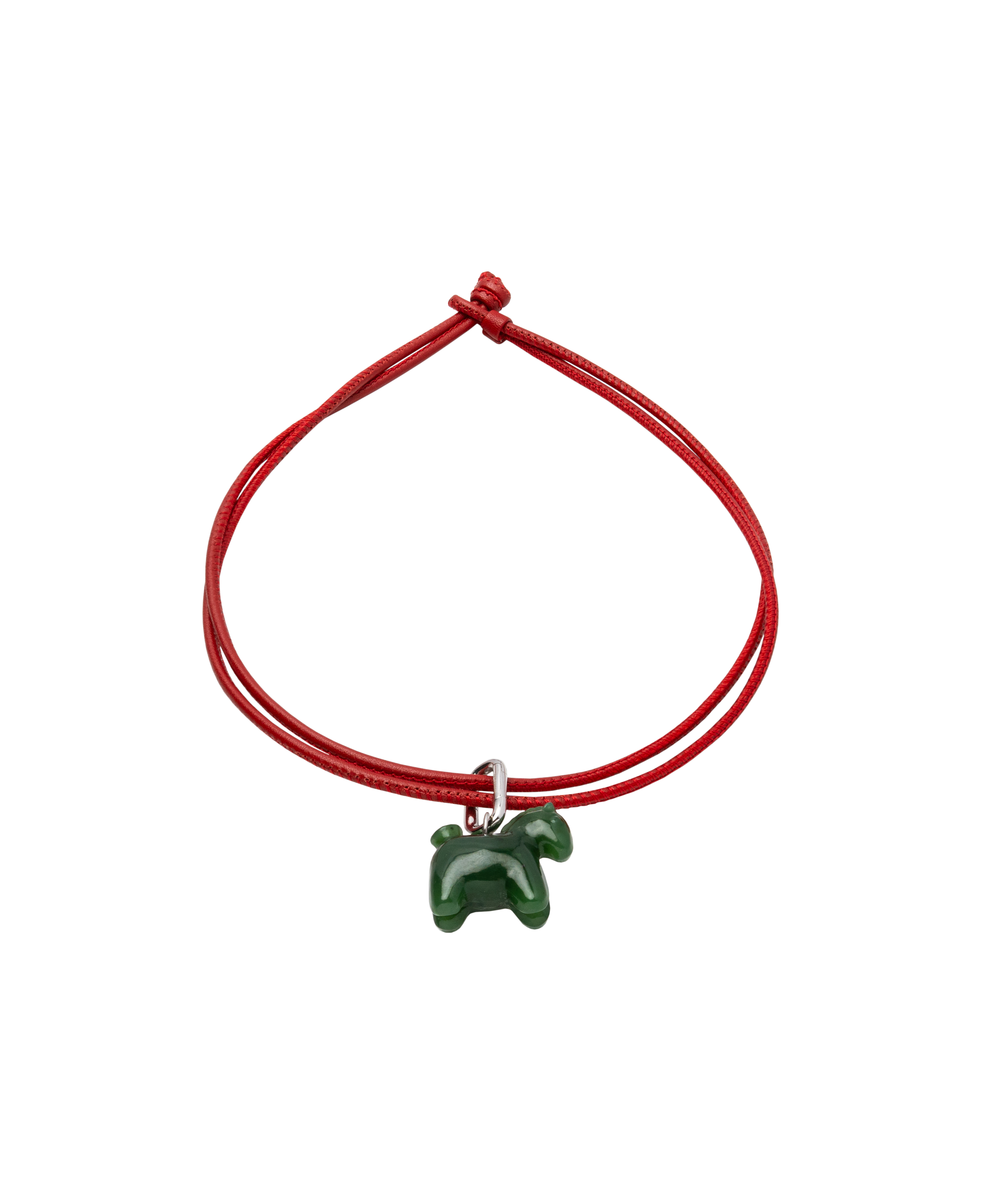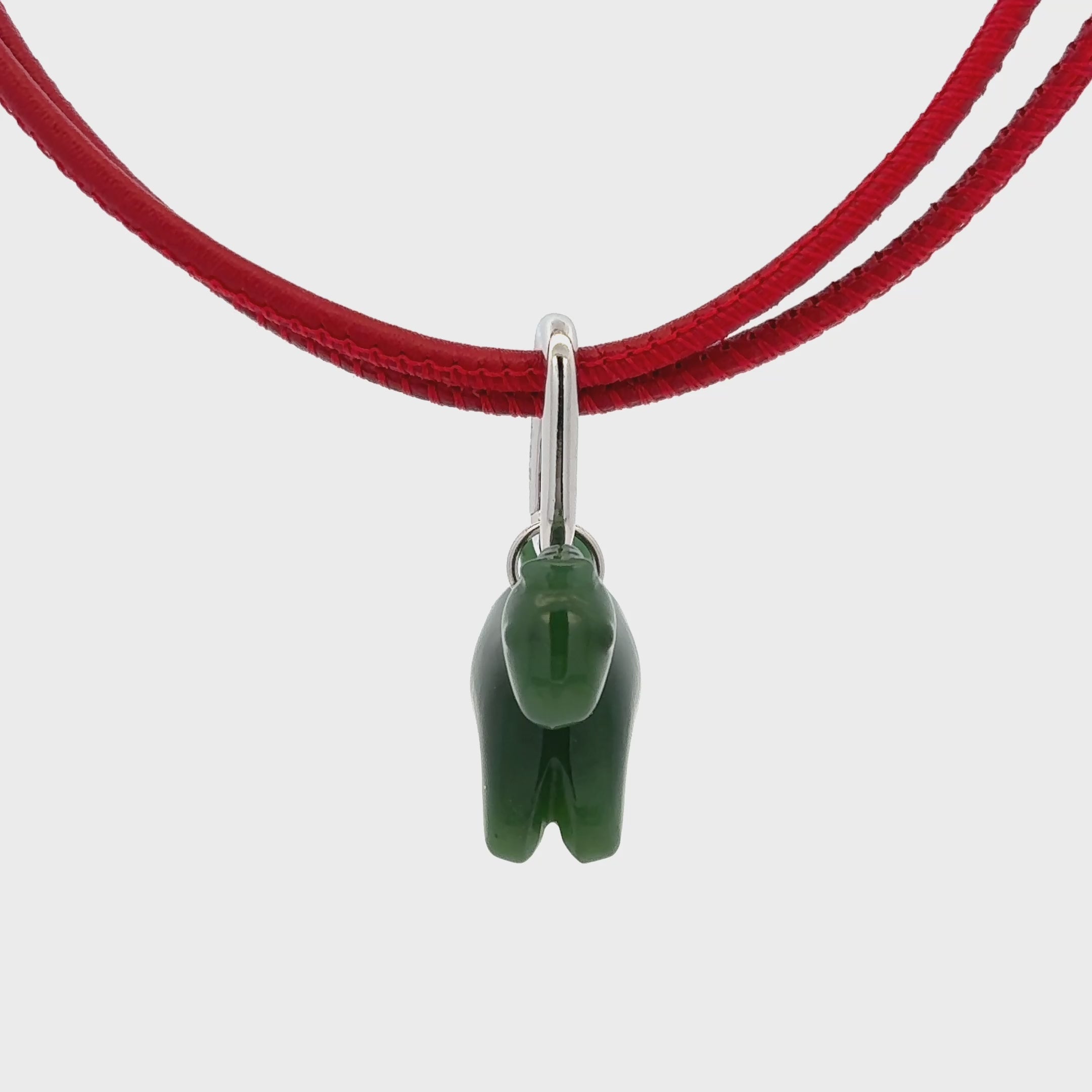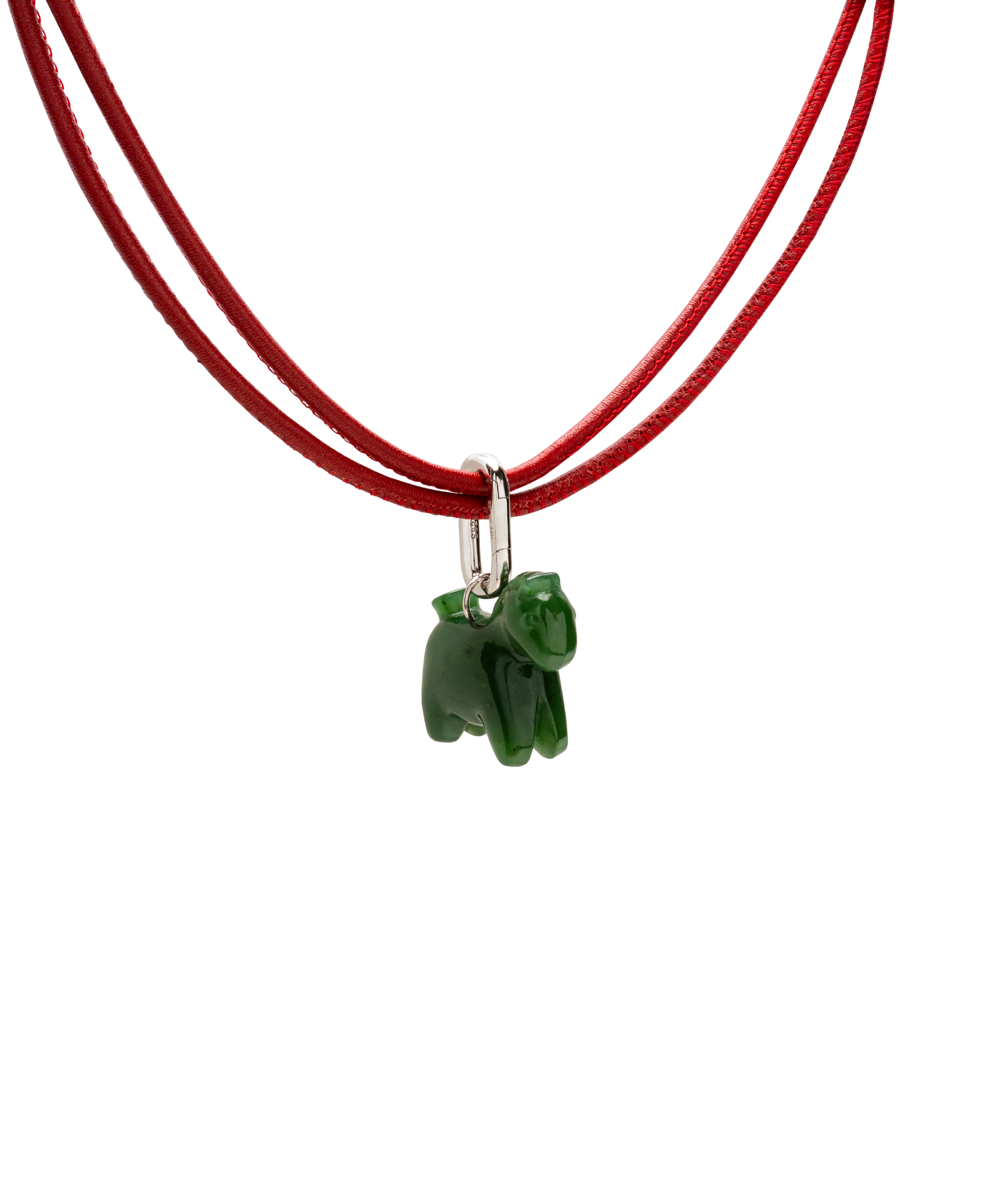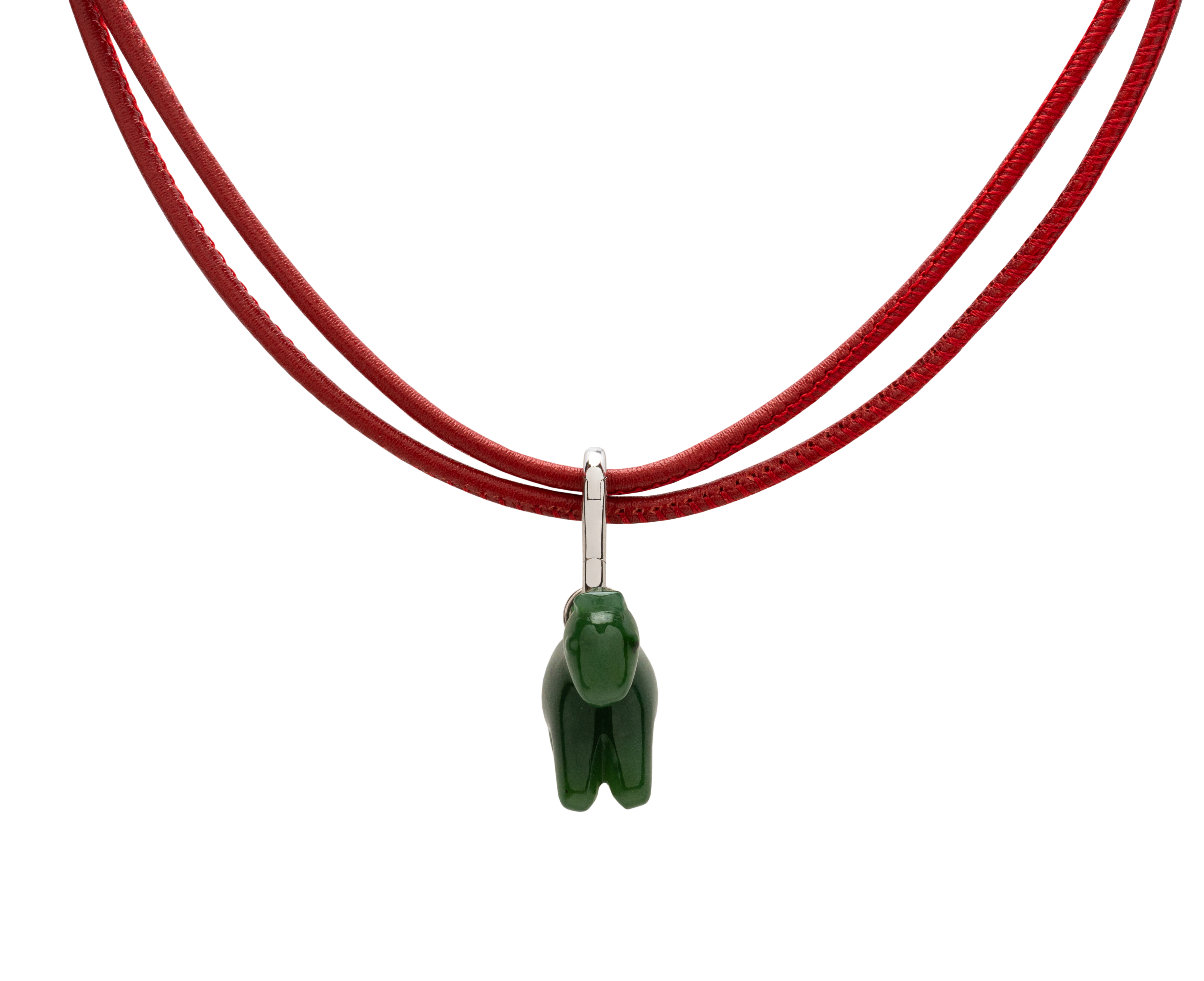 Hand-carved from Russian Jade, the pendant reveals a premium spinach green hue with a juicy, waxy texture that feels buttery and alive against the skin. Paired effortlessly with a red calf leather necklace for a casual yet bold look. Beyond its beauty, Jade is believed to summon swift fortune while wrapping its wearer in a veil of serene protection, reminding you to navigate 2026 with the strength and poise of a horse in flight.