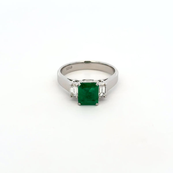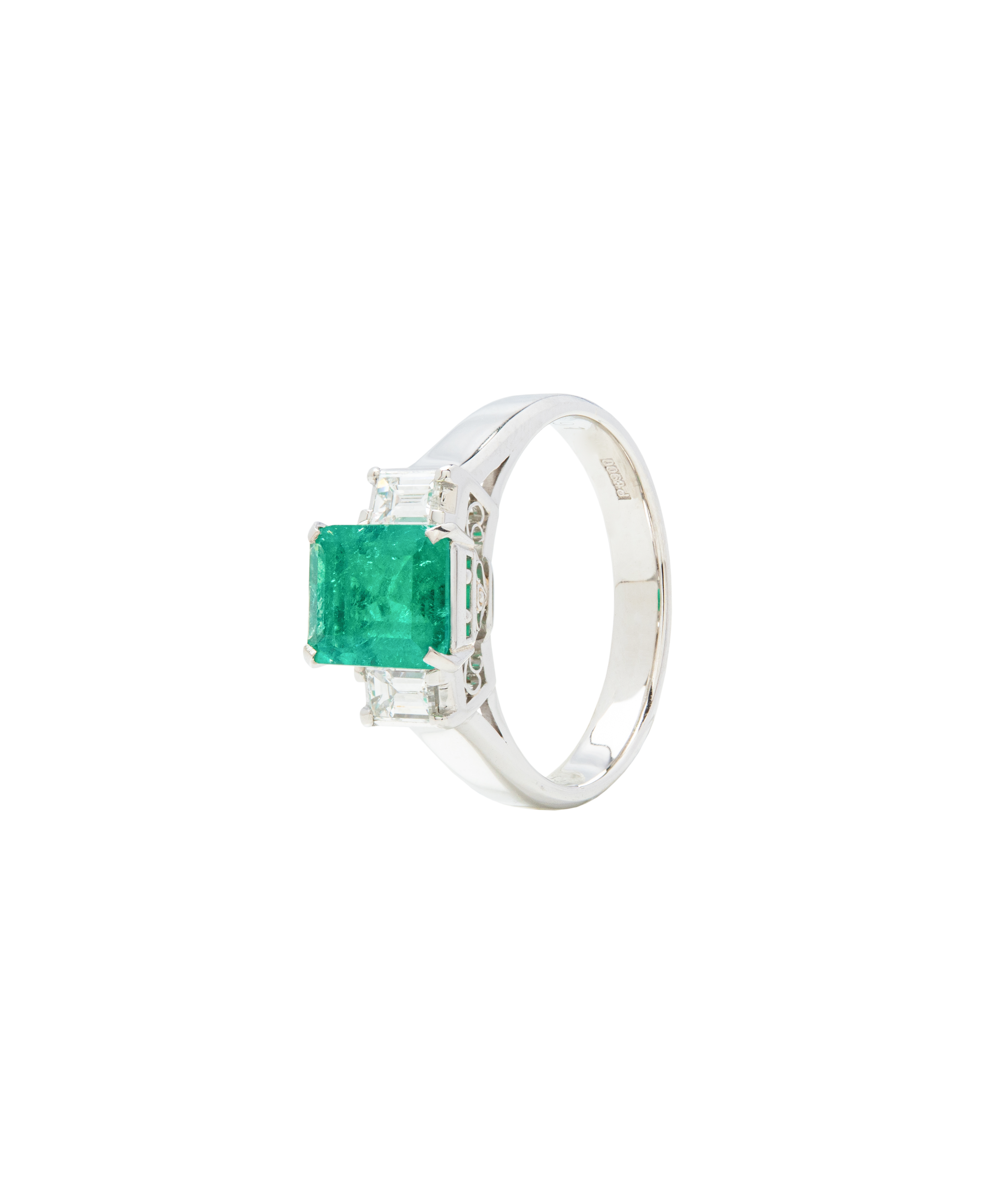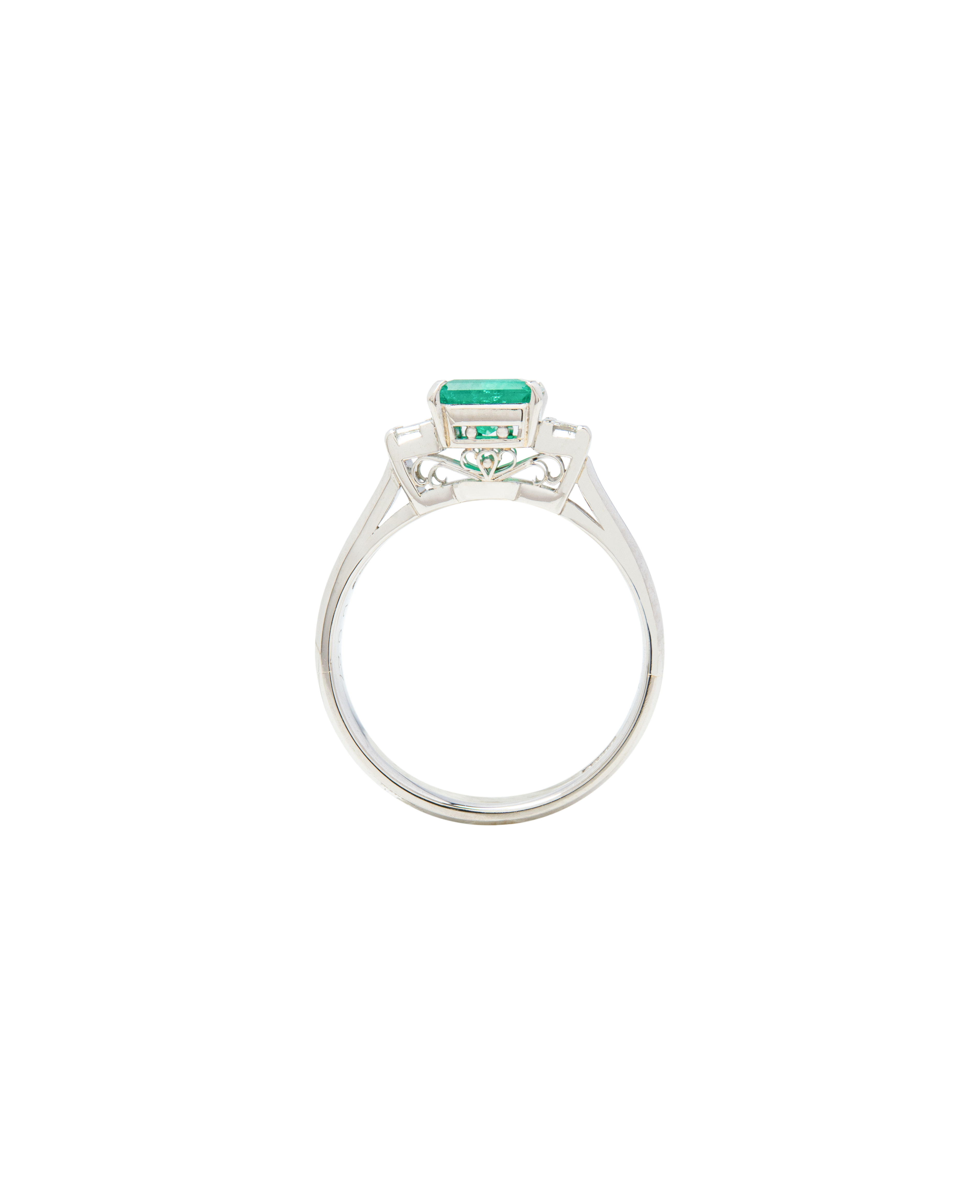 At the center of this ring is an exceptional emerald-cut Muzo emerald, sourced from the legendary Muzo mines of Colombia. Renowned for its rich, old-mine saturation, the stone is framed by architectural baguette diamonds that enhance its depth and presence.