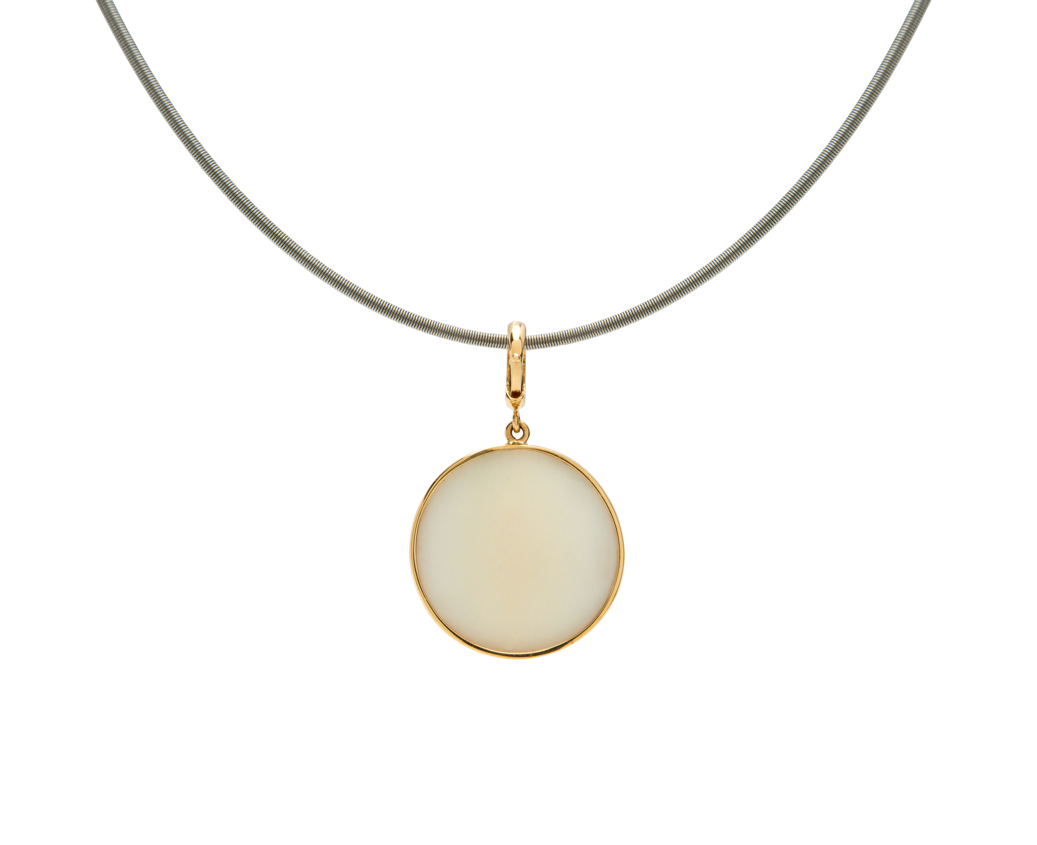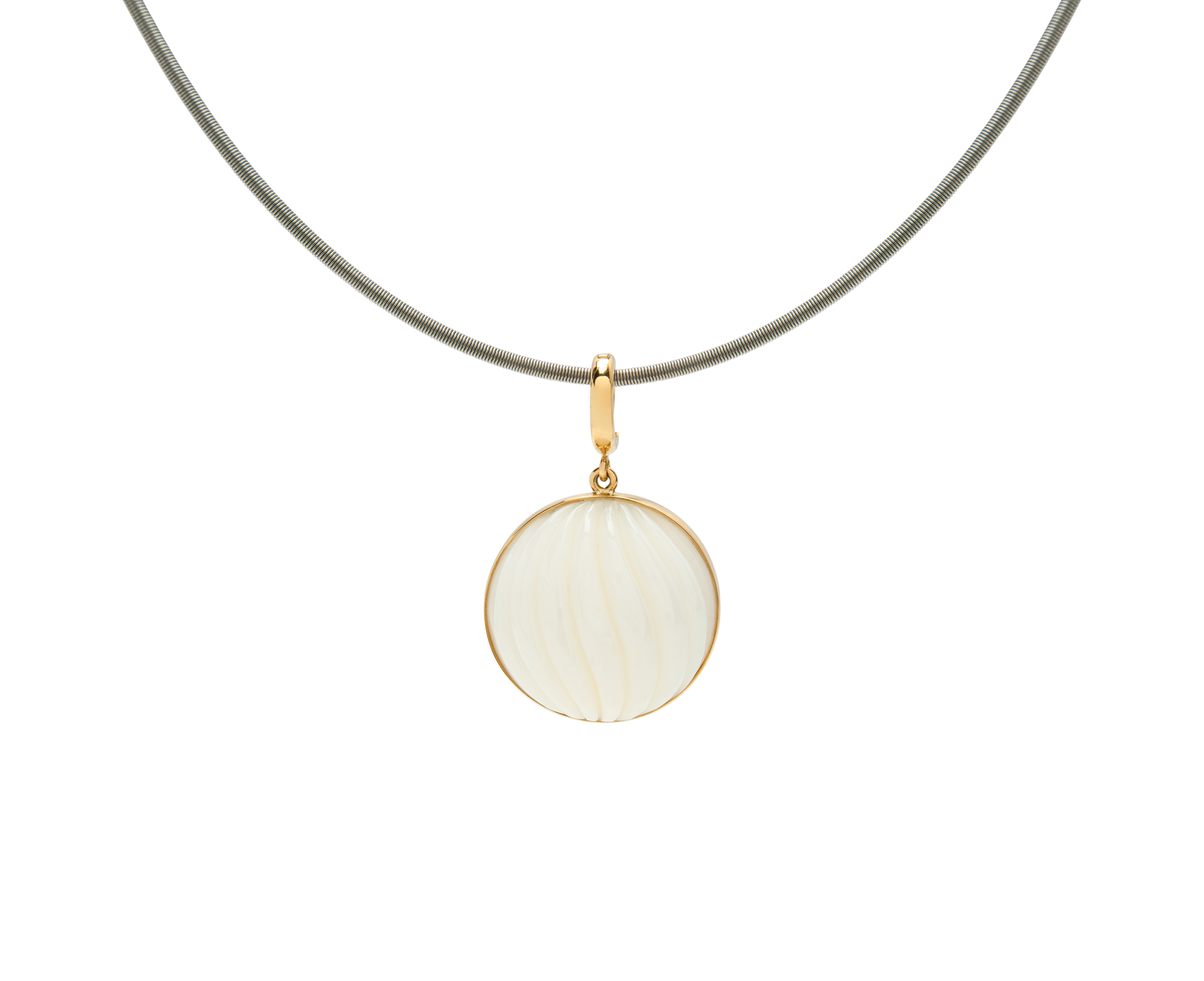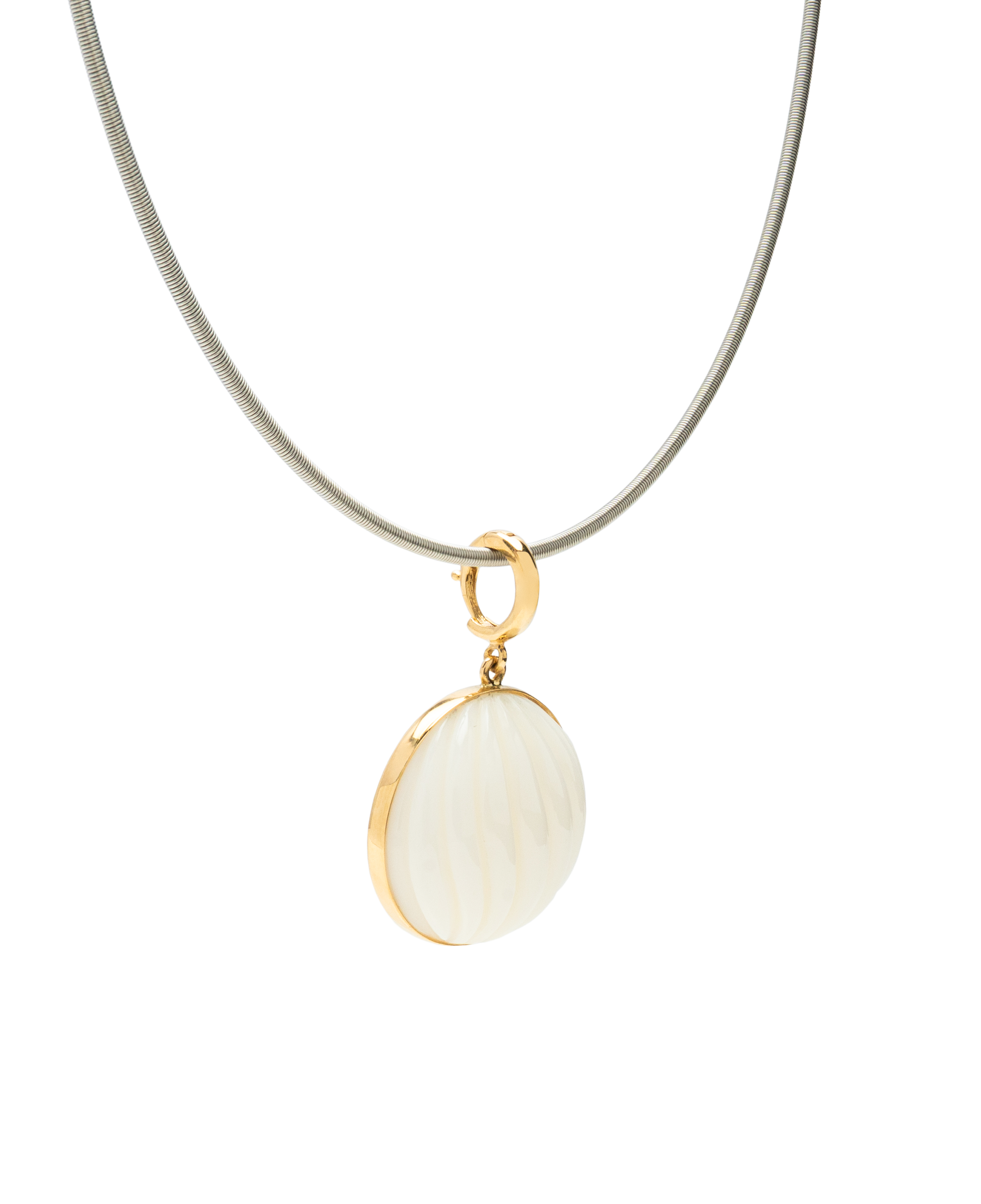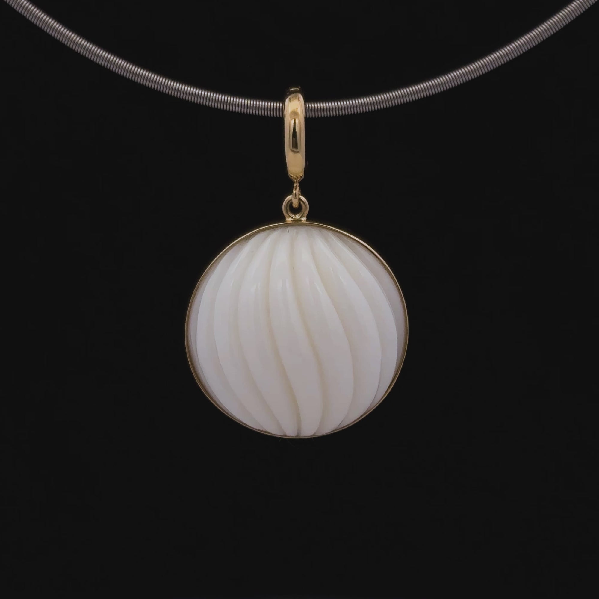 The Shiro Sango white coral is prized for its pure snow-white body; it displays a smooth, porcelain-like texture with a soft inner glow. Hand-carved into an elegant Kabocha silhouette by skilled artisans, the pendant is then hand-polished to a velvety lustre, reminiscent of a snow solidified into a perfect little talisman. Set in solid 18K gold, it blends traditional Japanese craftsmanship with the quiet luxury of vintage fine jewellery. Formed slowly over decades in the cold, pristine waters of Kochi, this rare white coral pendant is effortlessly versatile, pairing beautifully with any chain and any outfit, from morning elegance to night sophistication. A refined keepsake with heirloom presence. Classically Yours.