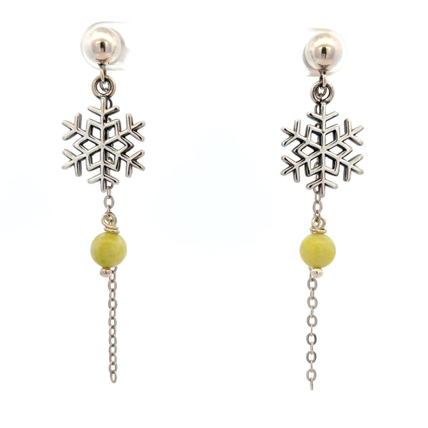 Snowflake holiday earrings, yellow Canadian Jade baubles symbolize sunshine and warmth that barely come by in winter. Intricate Sterling Silver snowflakes...
