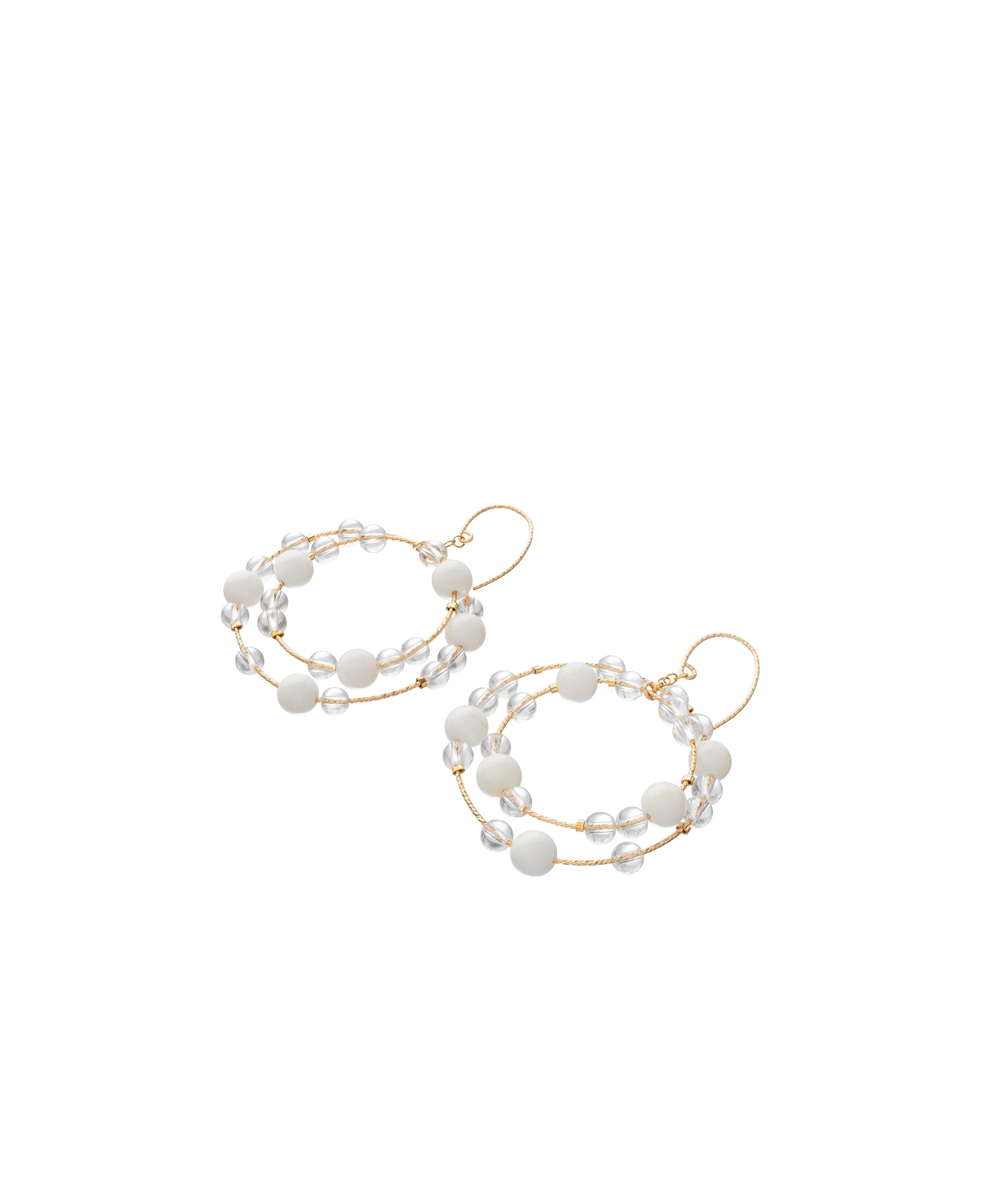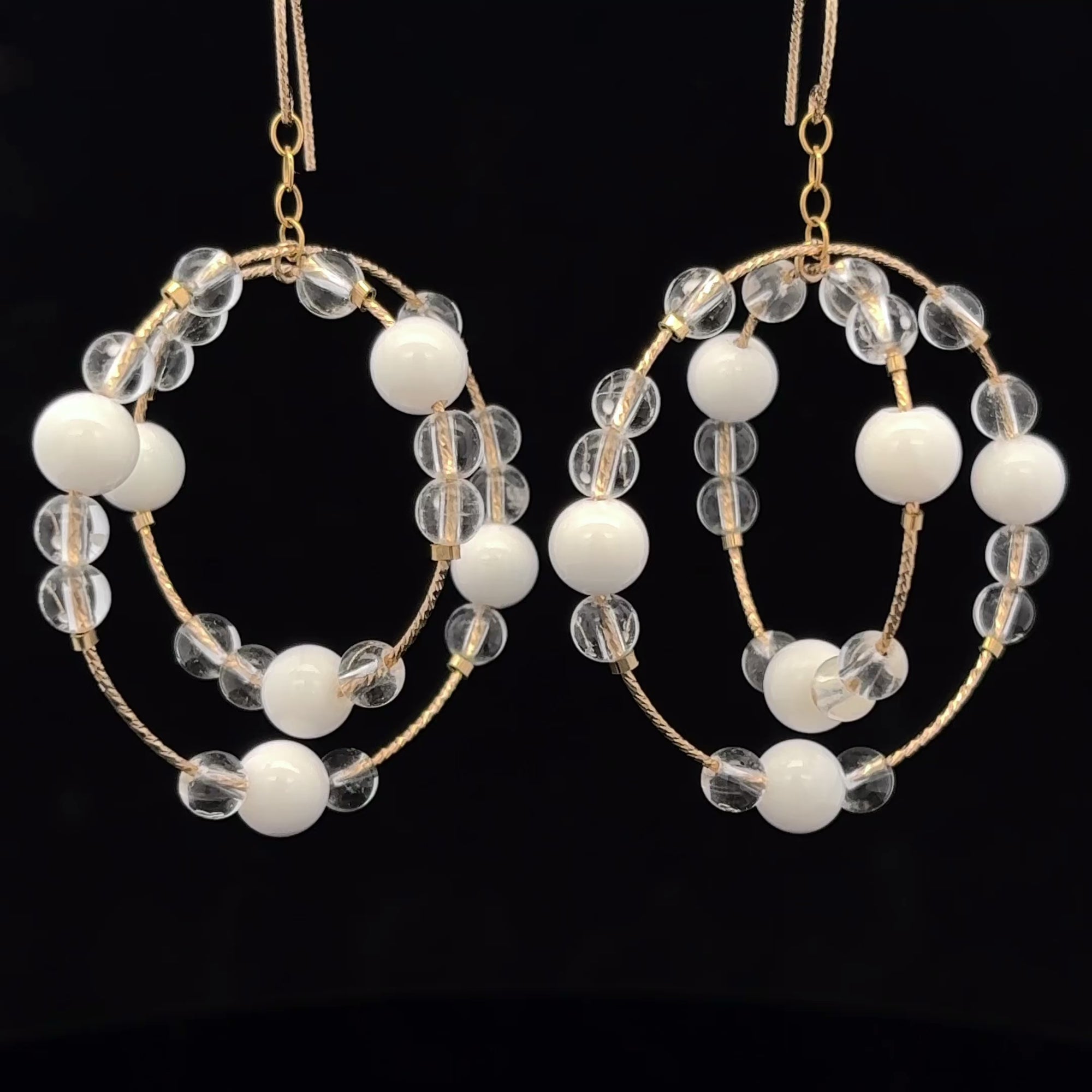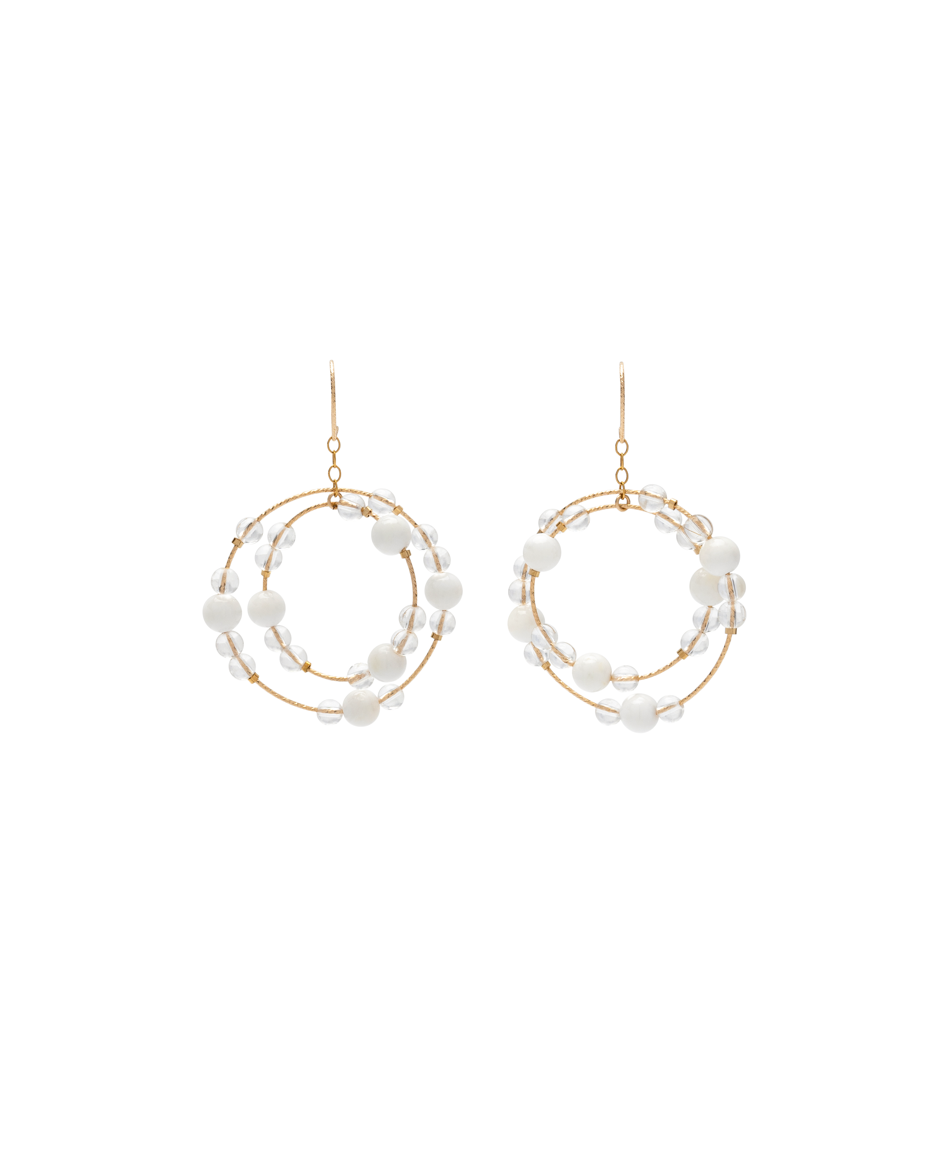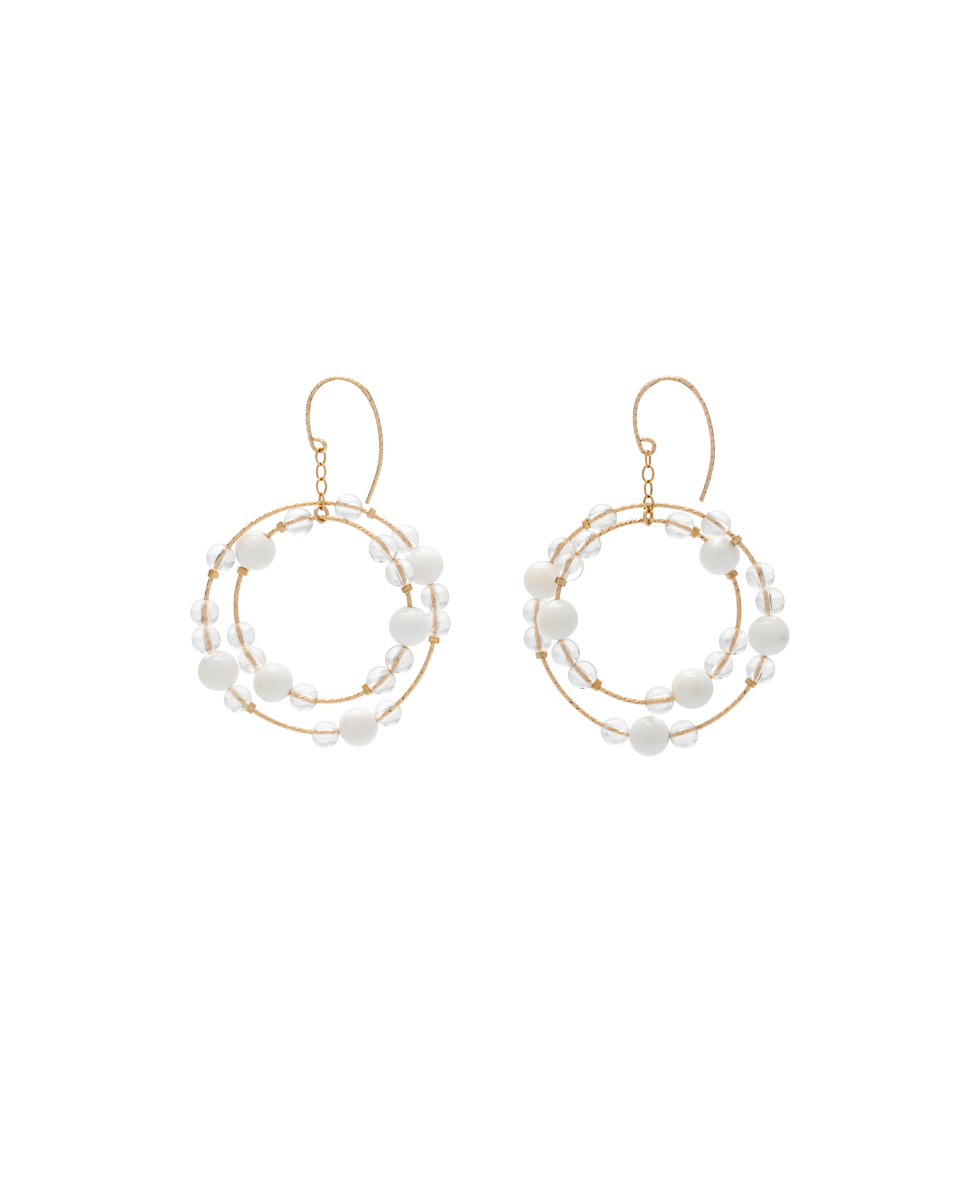 Light as sea foam and radiant as the morning tide, the Summer Beach Earrings capture the tranquil rhythm of the ocean. Handcrafted with luminous fossil Tridacna from the Indian Ocean and sparkling Rock Crystal from Brazil, each bead dances along a 14kgf gold hoop like sunlit ripples upon water.