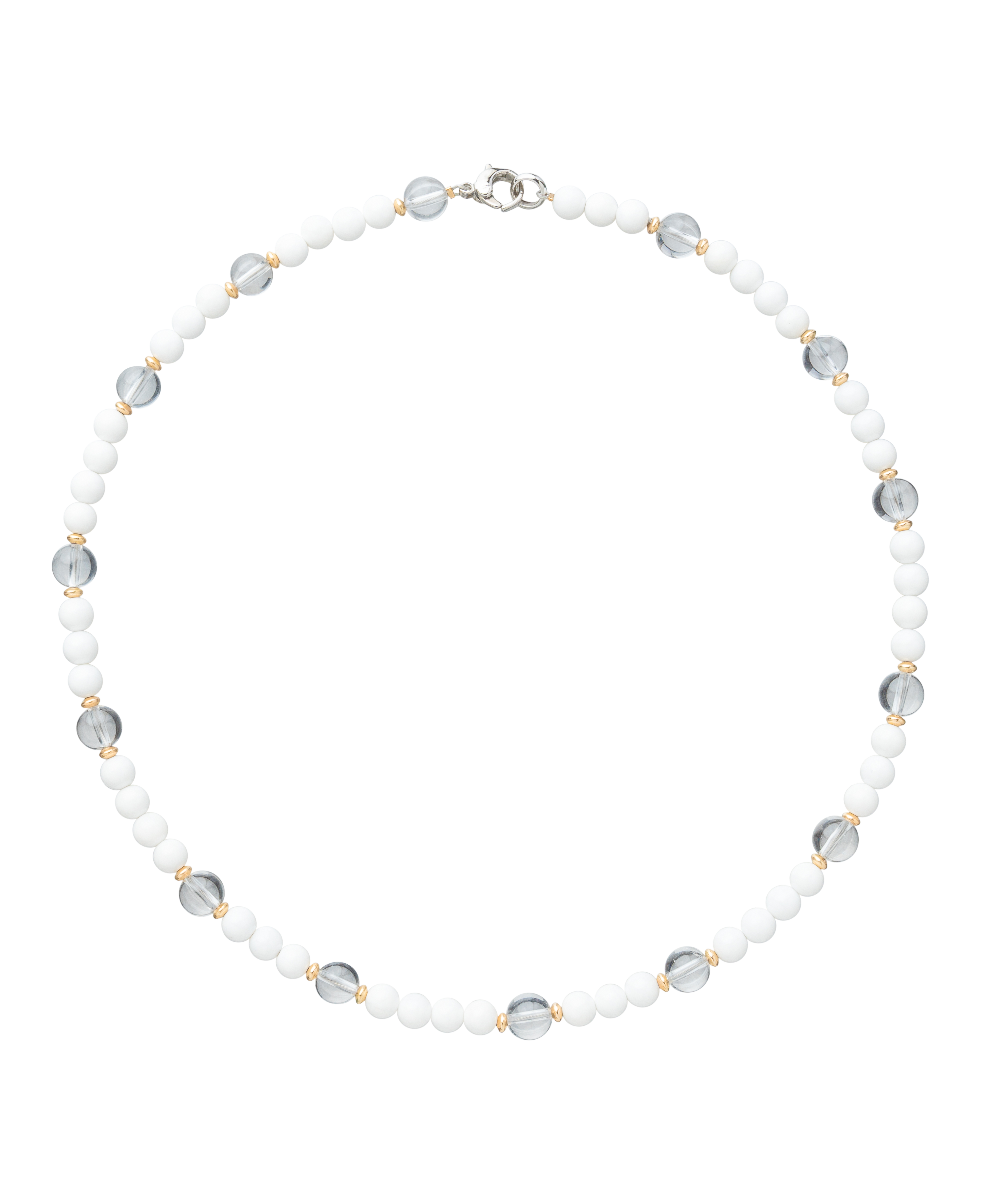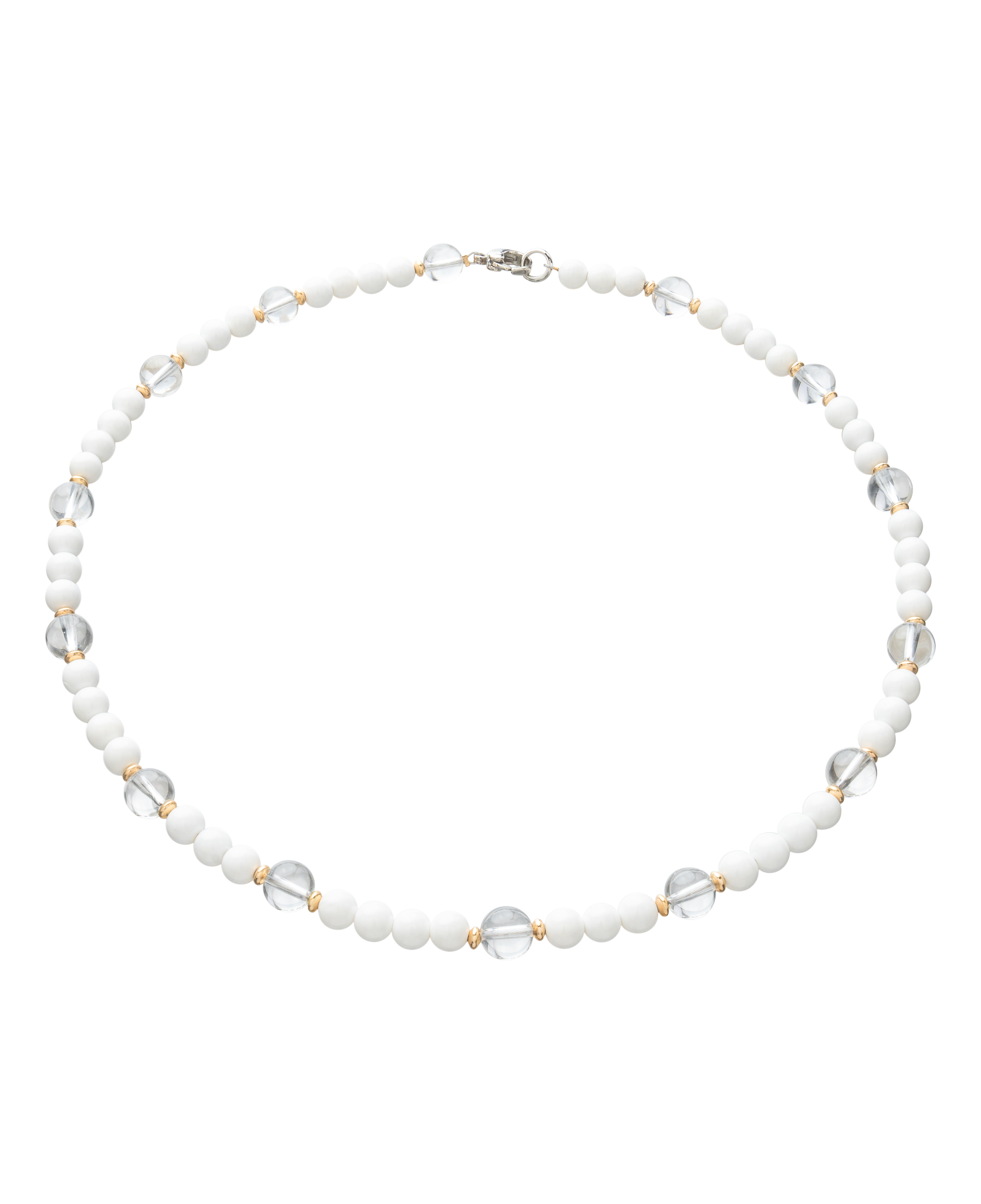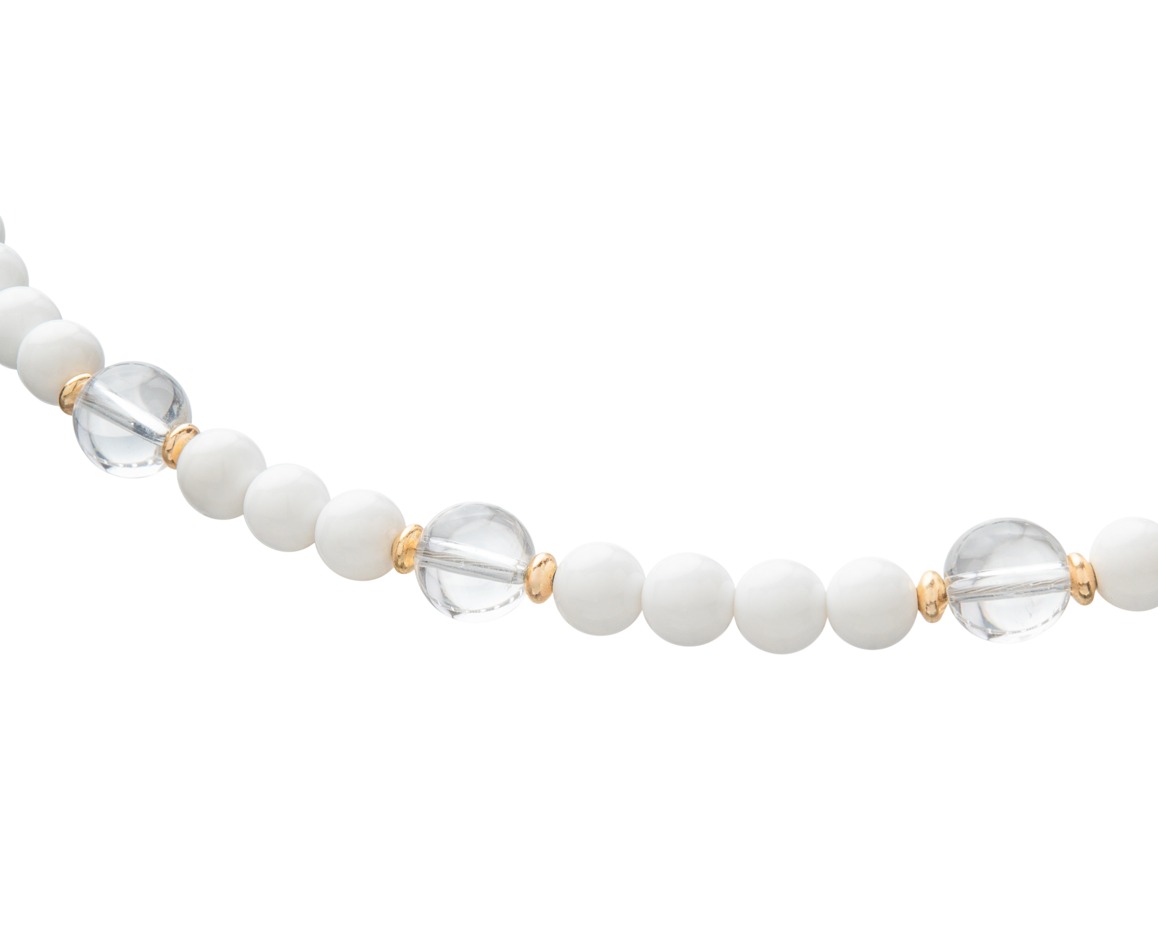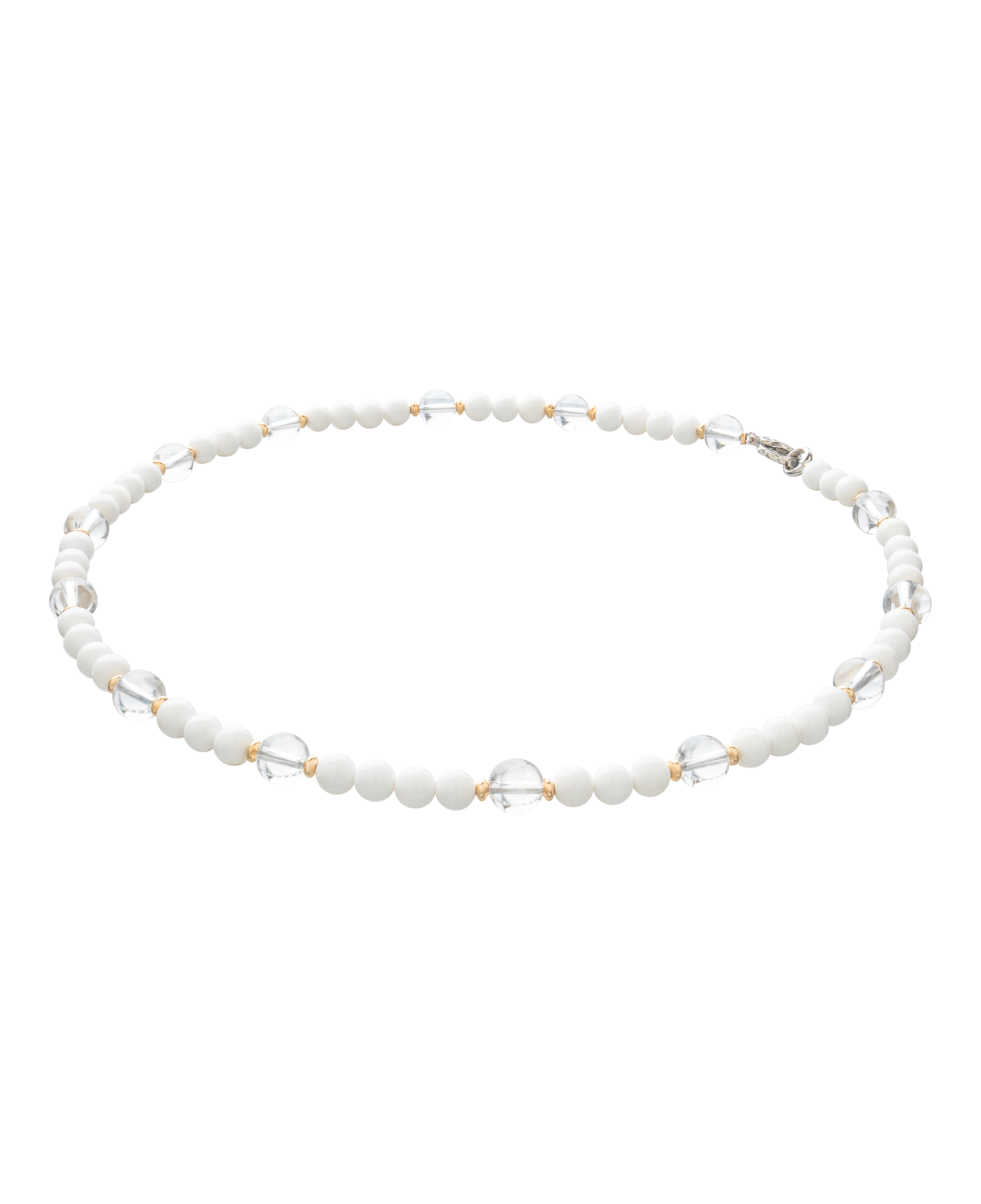 The Summer Beach Necklace is the collection’s centerpiece, a flowing strand of fossil Tridacna and radiant Rock Crystal, expanded from the bracelet into a graceful, elongated form. Smooth white beads evoke the stillness of seashells hidden beneath warm sand, while clear quartz reflects the crystalline waters of Brazil’s mountains.