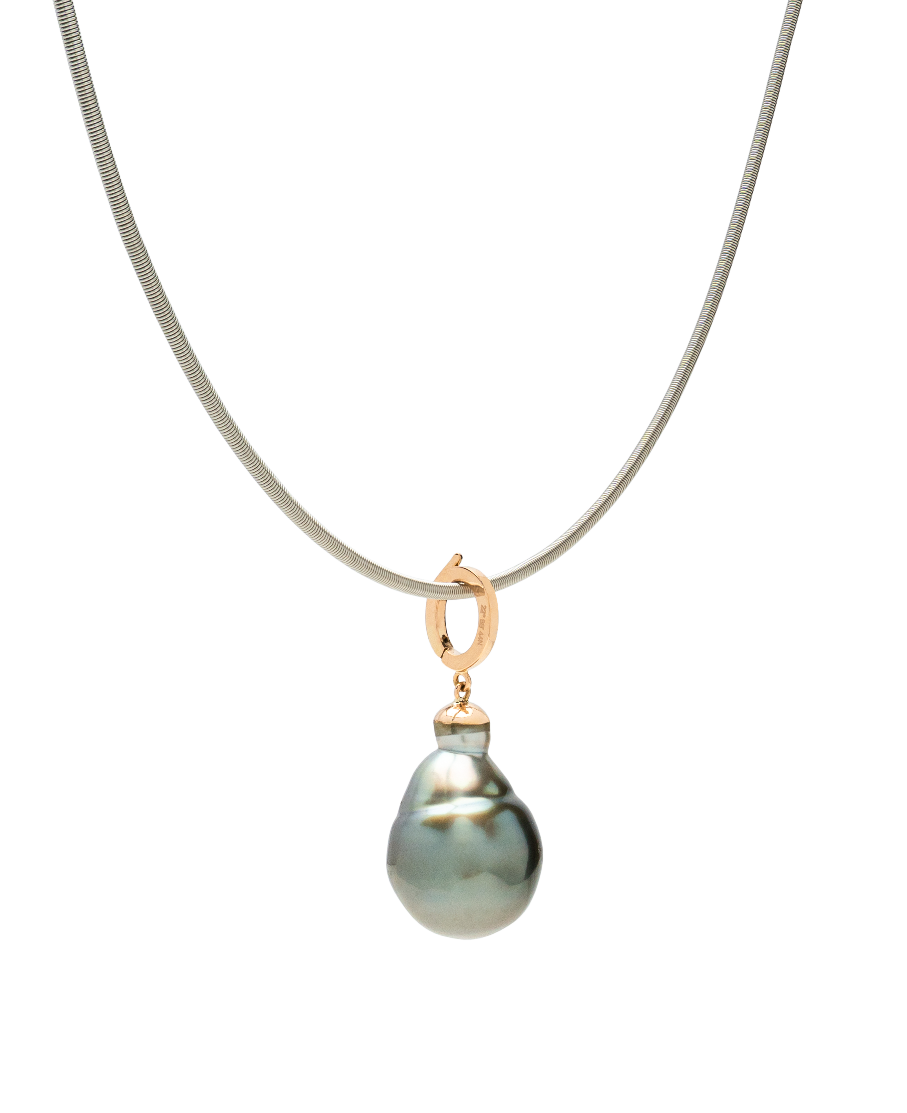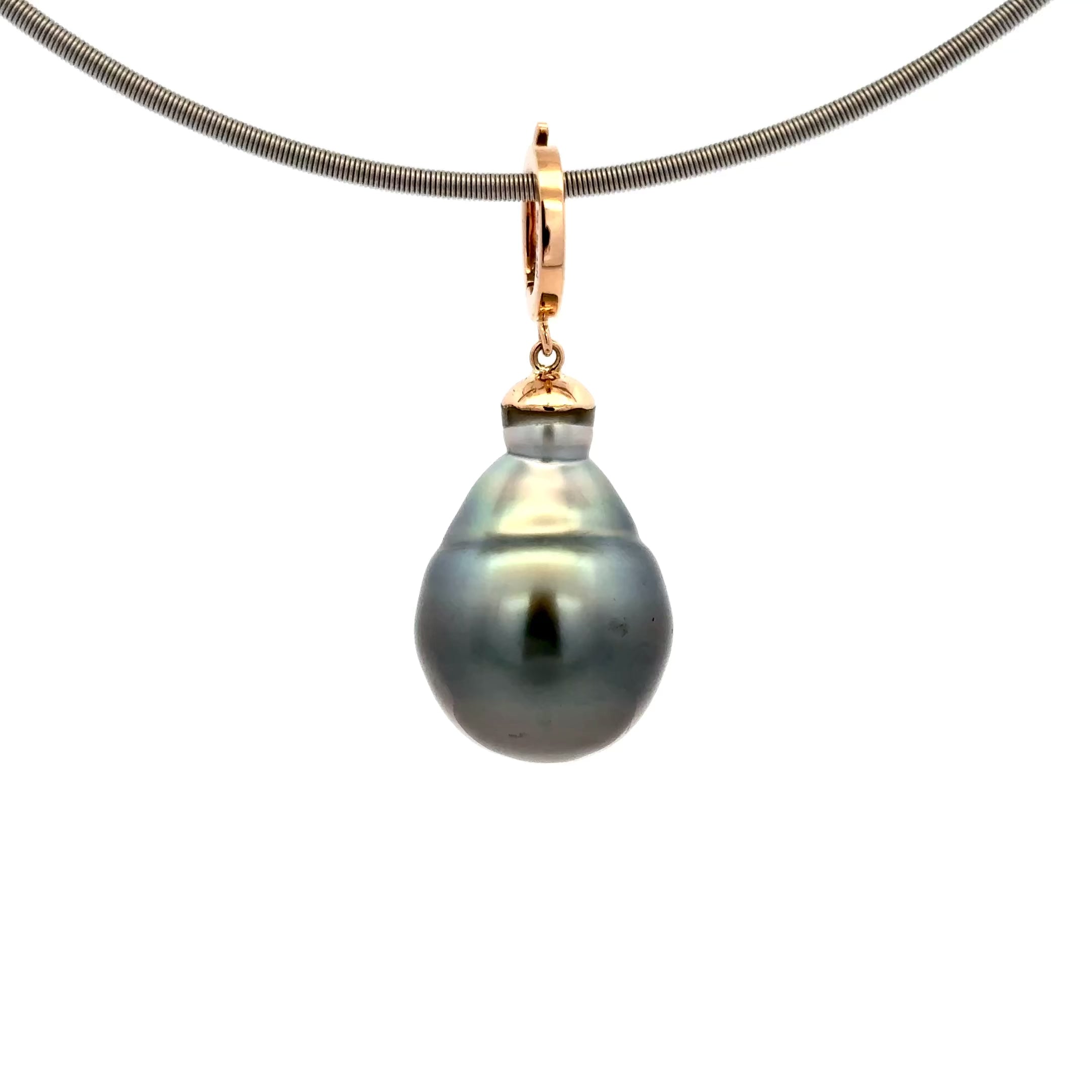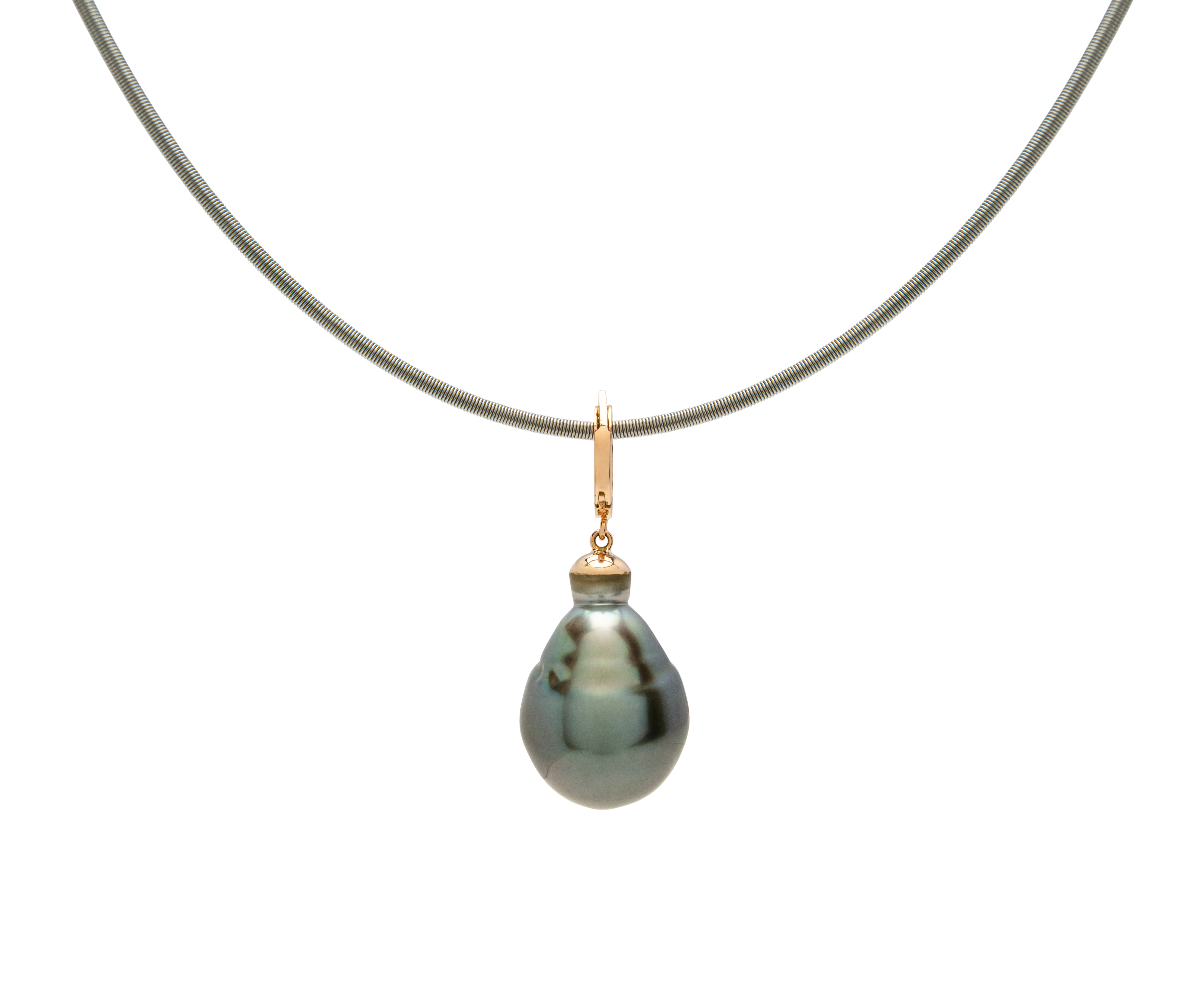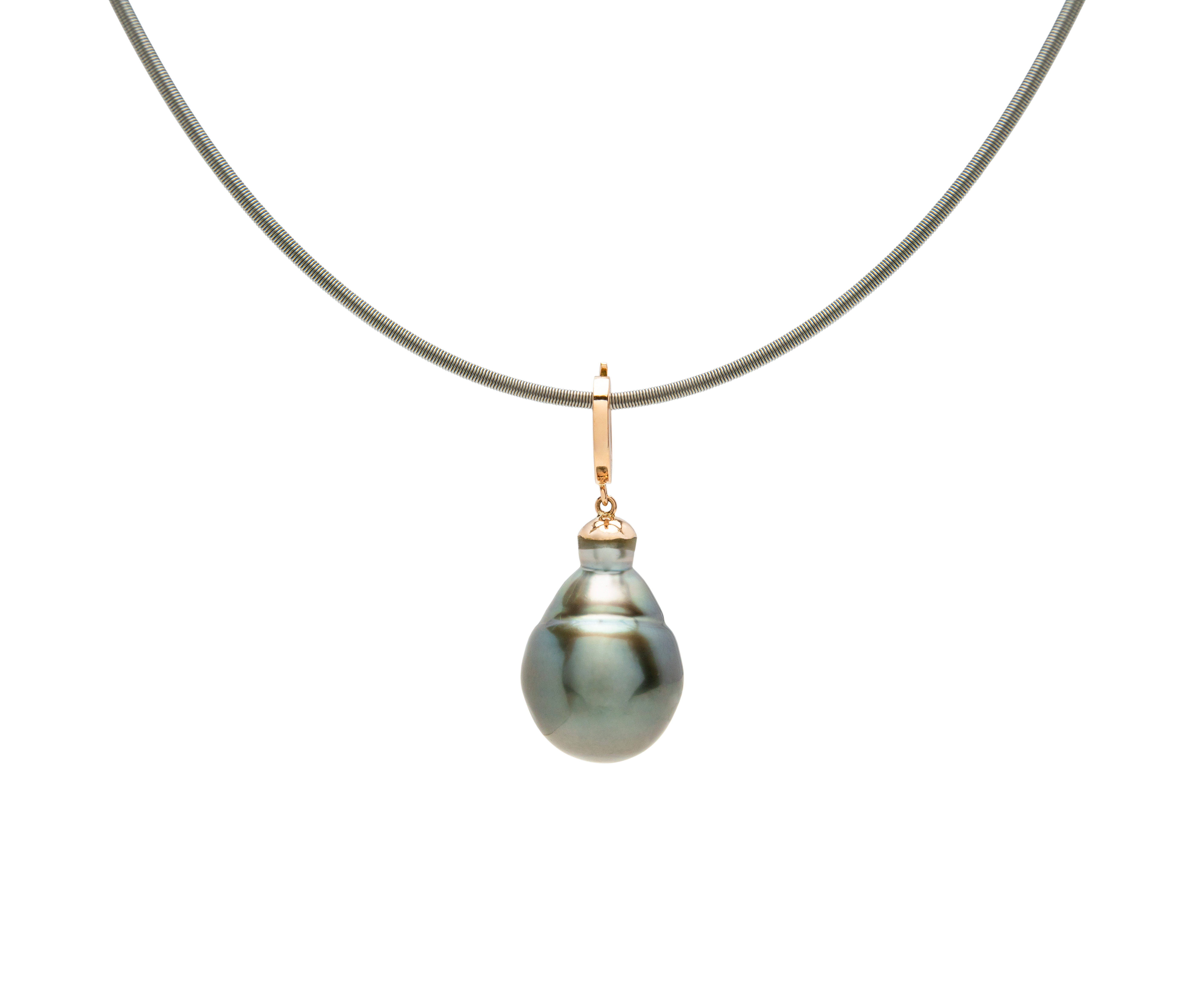 Dark Elegance, Unapologetic. Tahitian pearls from French Polynesia — the world’s only naturally dark pearls, glow with a distinctive near-black body colour, revealing soft iridescent overtones of green, blue-green, silver, and rose as they catch the light. This baroque-shaped gem carries an organic, unrestrained beauty, full of natural character and depth.