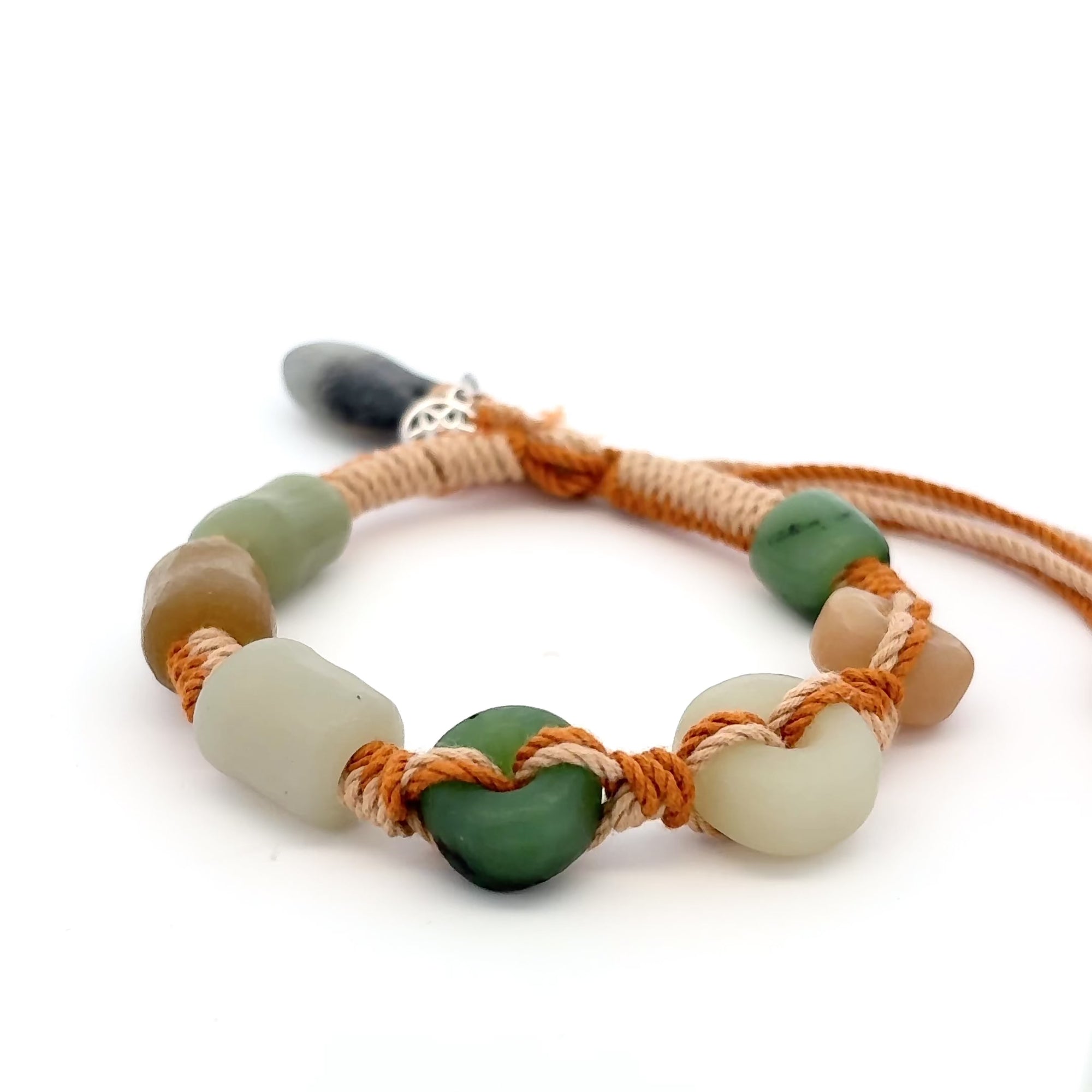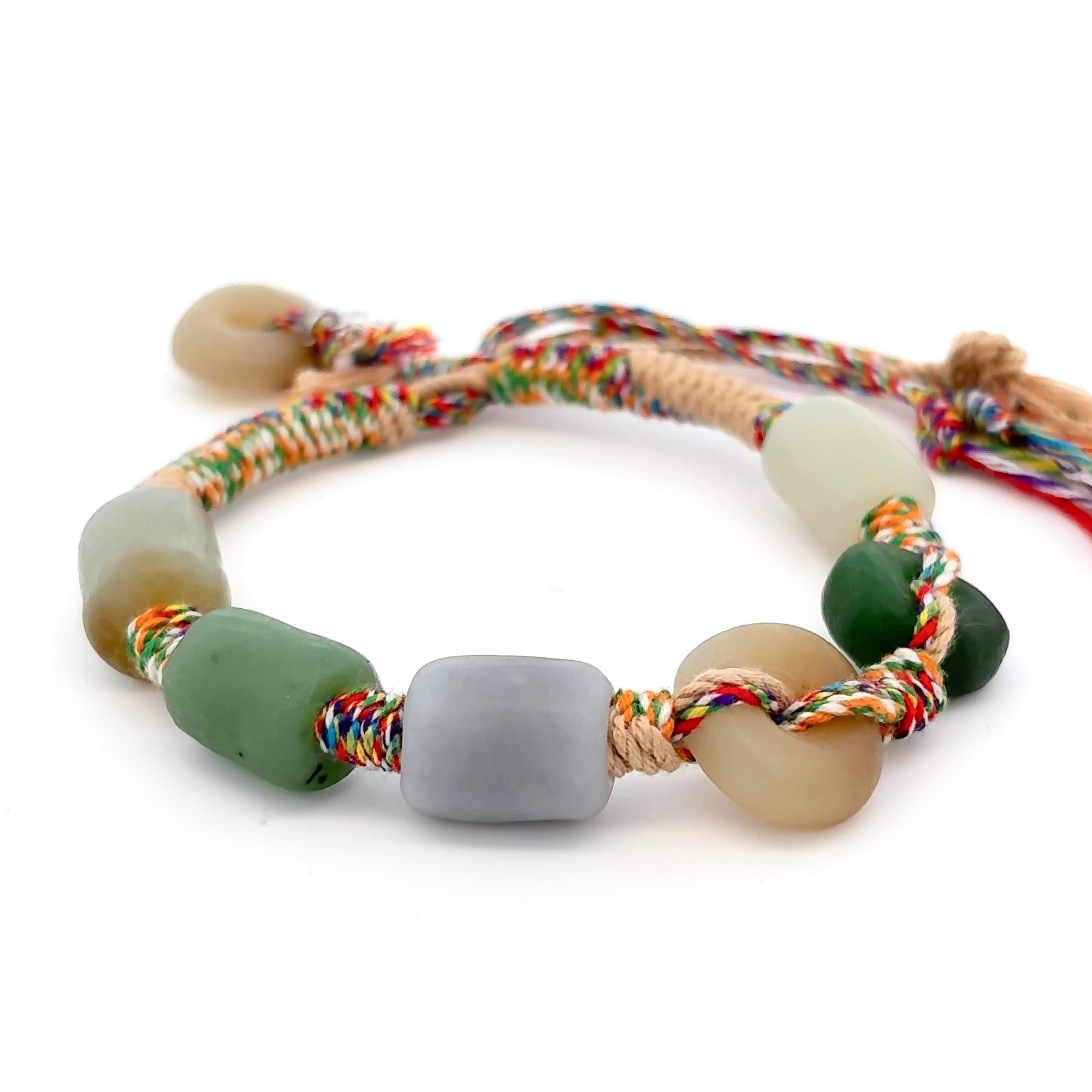 A grand ceremonial dance commences and synchronized feet stomp into the ground with such force that the ground shakes a little. A worthy tribesman has earned their commemoration of honor - an intricate bracelet. Multicolored fibers are twisted into one to hold onto five rare Jade gemstones to represent the virtues of mercy, modesty, courage, valor, and wisdom.