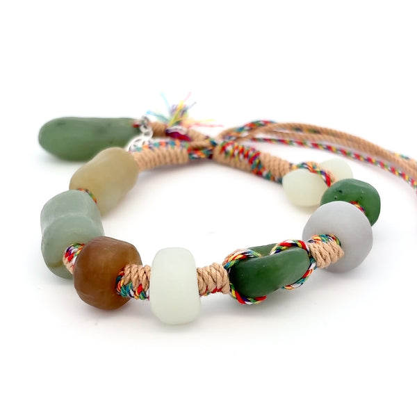 Found in Xinjiang, China, premium rough Jade is combed through before a selection of varied colors like creamy white, caramel brown, an intense earthy green, light lemon, and a striped brown are chosen. Each gemstone is thick with a smooth texture with creamy, greasy shine. Celebrate the power of the tribesman in the Tribesman Jade Bracelet - pure power rooted in the five virtues.