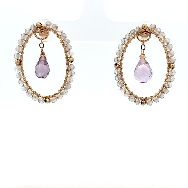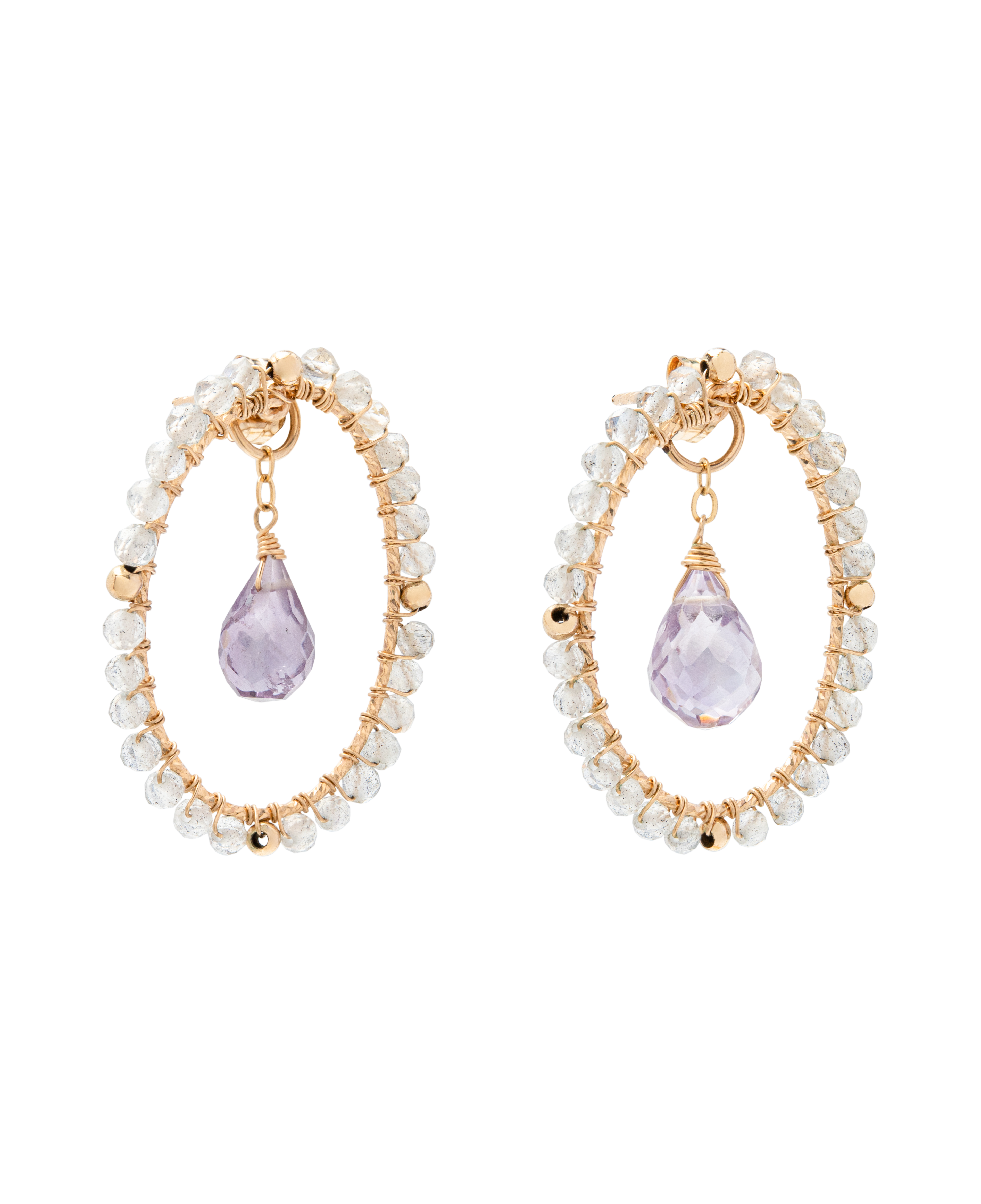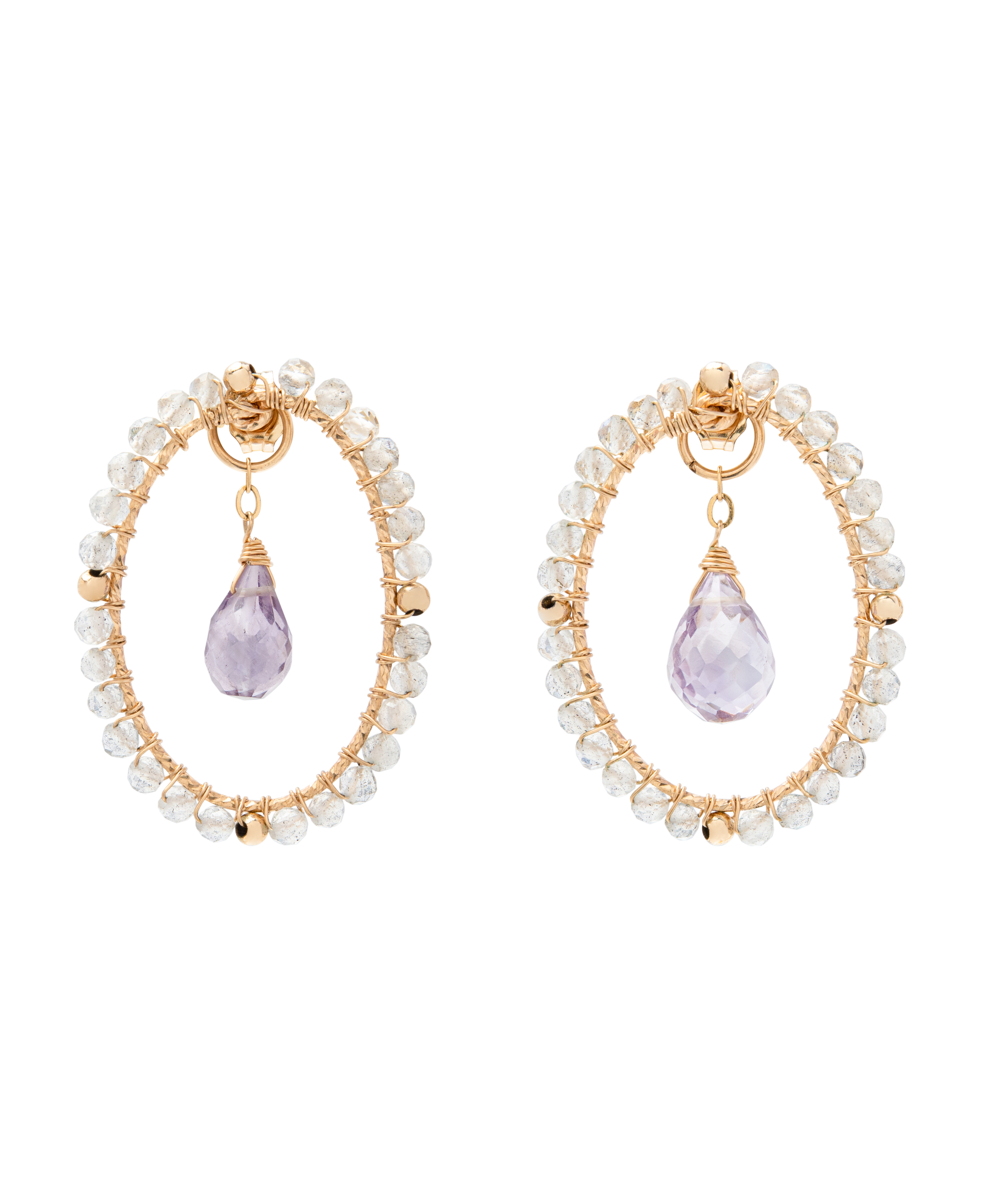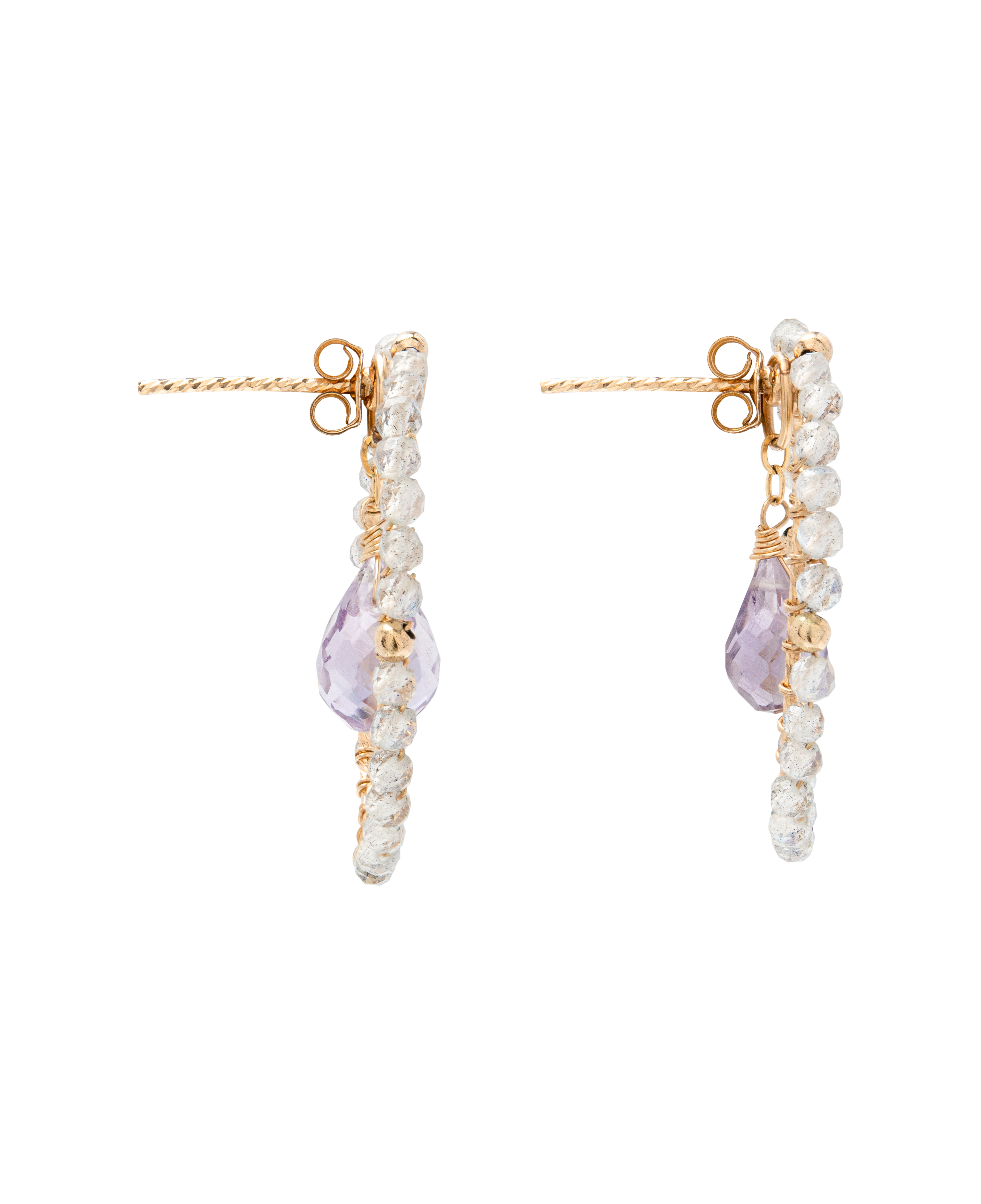 The Twilight Veil Earrings evoke the quiet hush of dusk, where lavender light softens, shadows lengthen, and the world slips into calm. A pear-cut Brazilian Amethyst forms the central drop, its soothing violet tone reflecting intuition and serenity. Surrounding it, hand-selected Labradorite beads shimmer with subtle greys and hidden blue flashes, each one hand-wired by skilled artisans to form an ethereal, twilight-like halo. Set in 14KGF, this piece can be worn as a full celestial hoop, or the Amethyst drop can be detached and worn as a pendant.